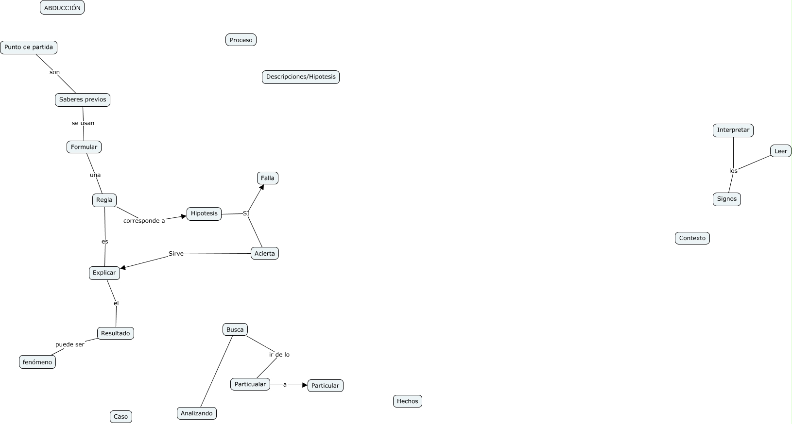 Este Cmap, tiene información relacionada con: Abduccion, Explicar el Resultado, Regla corresponde a Hipotesis, Saberes previos se usan Formular, Busca ???? Analizando, Regla es Explicar, Hipotesis SI Acierta, Resultado puede ser fenómeno, Punto de partida son Saberes previos, Interpretar los Signos, Leer los Signos, Acierta Sirve Explicar, Busca ir de lo Particualar, Formular una Regla, Particualar a Particular, Hipotesis SI Falla