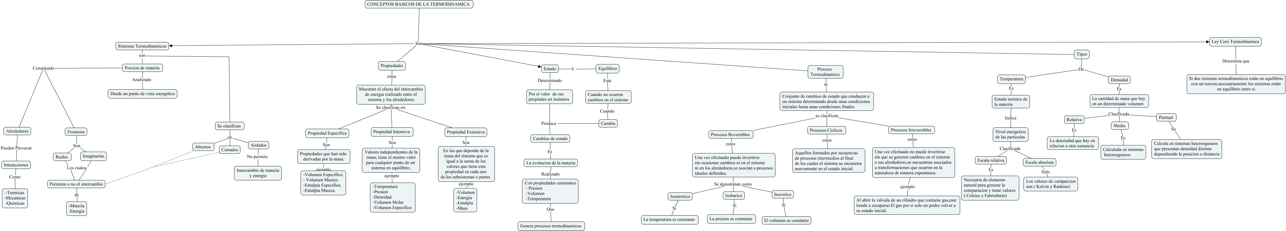 Este Cmap, tiene información relacionada con: TERMO, En las que depende de la masa del sistema que es igual a la suma de los valores que tiene esta propiedad en cada uno de los subsistemas o partes ejemplo -Volumen -Energia -Entalpia -Masa, Conjunto de cambios de estado que conducen a un sistema determinado desde unas condiciones iniciales hasta unas condiciones finales. se clasifican Procesos Reversibles, Reales Los cuales Permiten o no el intercambio, Se clasifican en Abiertos, Estado Y Equilibrio, Propiedades estas Muestran el efecto del intercambio de energia realizado entre el sistema y los alrededores., Procesos Irreversibles estos Una vez efectuado no puede invertirse sin que se generen cambios en el sistema o sus alrededores,se encuentran asociados a transformaciones que ocurren en la naturaleza de manera espontanea., Cambios de estado Es La evolucion de la materia, Isotermico Si La temperatura es constante, Interacciones Como -Termicas -Mecanicas -Quimicas, CONCEPTOS BASICOS DE LA TERMODINAMICA Son Propiedades, Nivel energetico de las particulas Clasificada Escala absoluta, Equilibrio Esta Cuando no ocurren cambios en el sistema, CONCEPTOS BASICOS DE LA TERMODINAMICA Son Ley Cero Termodinamica, Porcion de materia Constituido Alrededores, La cantidad de masa que hay en un determinado volumen Clasificada Media, Propiedades que han sido derivadas por la masa. ejemplo -Volumen Especifico. - Volumen Masico. -Entalpia Especifica. -Entalpia Masica., La evolucion de la materia Realizado Con propiedades constantes - Presion -Volumen -Temperatura, Conjunto de cambios de estado que conducen a un sistema determinado desde unas condiciones iniciales hasta unas condiciones finales. se clasifican Procesos Irreversibles, Valores independientes de la masa; tiene el msimo valor para cualquier punto de un sistema en equilibrio. ejemplo -Temperatura -Presion -Densidad -Volumen Molar -Volumen Especifico