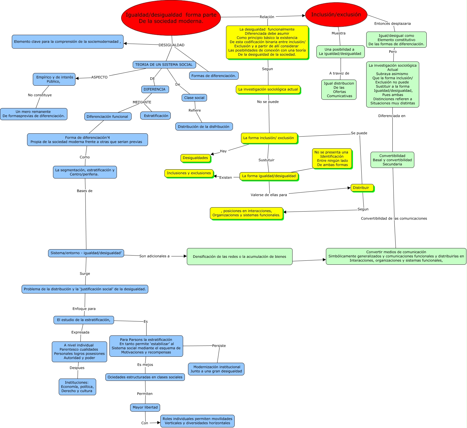 Este Cmap, tiene información relacionada con: inclusion social, Diferenciación funcional ???? Forma de diferenciación’4 Propia de la sociedad moderna frente a otras que serian previas, Igual/desigual como Elemento constitutivo De las formas de diferenciación. Pero La investigación sociológica Actual Subraya asimismo Que la forma inclusión/ Exclusión no puede Sustituir a la forma Igualdad/desigualdad, Pues ambas Distinciones refieren a Situaciones muy distintas, La forma inclusión/ exclusión Hay Desigualdades, La forma igualdad/desigualdad Existen Inclusiones y exclusiones, La investigación sociológica Actual Subraya asimismo Que la forma inclusión/ Exclusión no puede Sustituir a la forma Igualdad/desigualdad, Pues ambas Distinciones refieren a Situaciones muy distintas Diferenciada en Convertibilidad Basal y convertibilidad Secundaria, Igualdad/desigualdad forma parte De la sociedad moderna. Relación La desigualdad funcionalmente Diferenciada debe asumir Como principio básico la existencia De esta codificación binaria entre inclusión/ Exclusión y a partir de allí considerar Las posibilidades de conexión con una teoría De la desigualdad de la sociedad., Igualdad/desigualdad forma parte De la sociedad moderna. DESIGUALDAD Formas de diferenciación., Inclusión/exclusión Muestra Una posibilidad a La igualdad/desigualdad, La segmentación, estratificación y Centro/periferia. Bases de Sistema/entorno - igualdad/desigualdad’, TEORIA DE UN SISTEMA SOCIAL De Clase social, La forma inclusión/ exclusión Se puede Distribuir, Igualdad/desigualdad forma parte De la sociedad moderna. DESIGUALDAD Elemento clave para la comprensión de la sociemodernadad ,, Inclusión/exclusión Entonces desplazaria Igual/desigual como Elemento constitutivo De las formas de diferenciación., El estudio de la estratificación, Es Para Parsons la estratificación En tanto permite ‘estabilizar’ al Sistema social mediante el esquema de Motivaciones y recompensas, Ociedades estructuradas en clases sociales Permiten Mayor libertad, Clase social Refiere Distribución de la disfribución, Convertibilidad Basal y convertibilidad Secundaria Convertibilidad de las comunicaciones Convertir medios de comunicación Simbólicamente generalizados y comunicaciones funcionales y distribuirlas en Interacciones, organizaciones y sistemas funcionales,, Distribuir Segun , posiciones en interacciones, Organizaciones y sistemas funcionales., A nivel individual Parentesco cualidades Personales logros posesiones Autoridad y poder Despues Instituciones: Economía, política, Derecho y cultura, Igualdad/desigualdad forma parte De la sociedad moderna. DESIGUALDAD TEORIA DE UN SISTEMA SOCIAL