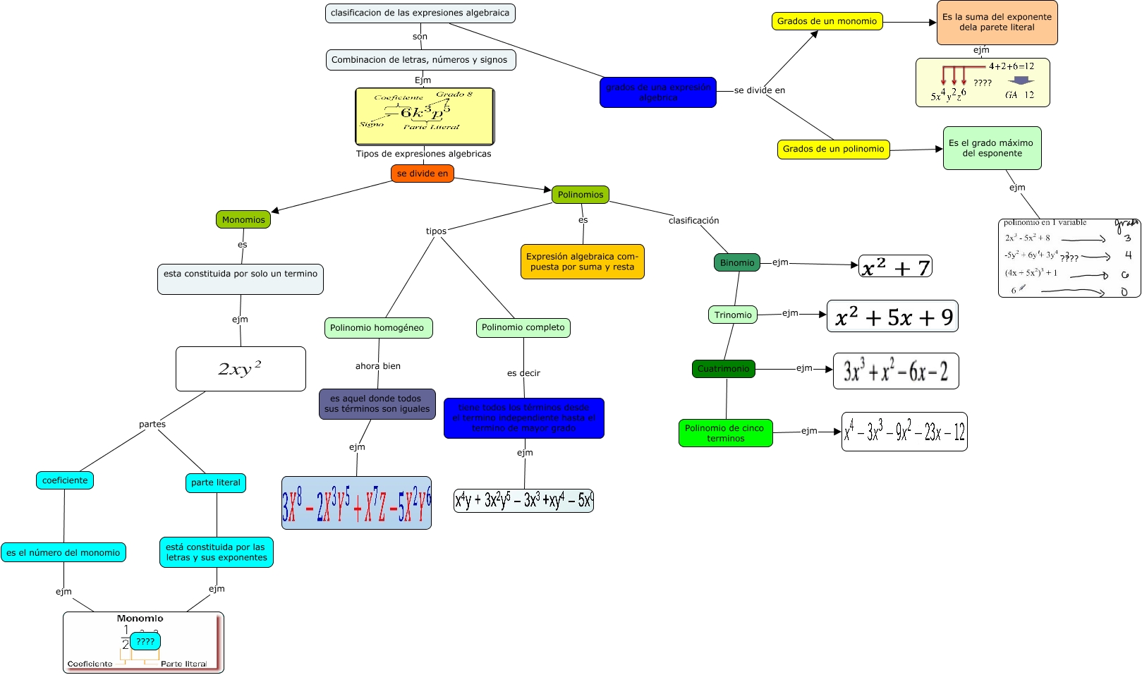 Este Cmap, tiene información relacionada con: expresiones algebraicas, Binomio ???? Trinomio, partes coeficiente, grados de una expresión algebrica se divide en Grados de un polinomio, Tipos de expresiones algebricas se divide en, es aquel donde todos sus términos son iguales ejm, grados de una expresión algebrica se divide en Grados de un monomio, Polinomios tipos Polinomio completo, Grados de un monomio es Es la suma del exponente dela parete literal, Cuatrimonio ???? Polinomio de cinco terminos, Trinomio ???? Cuatrimonio, tiene todos los términos desde el termino independiente hasta el termino de mayor grado ejm, Trinomio ejm, es el número del monomio ejm, se divide en en Monomios, parte literal ???? está constituida por las letras y sus exponentes, está constituida por las letras y sus exponentes ejm ????, coeficiente ???? es el número del monomio, Polinomios tipos Polinomio homogéneo, Monomios es esta constituida por solo un termino, clasificacion de las expresiones algebraica ???? grados de una expresión algebrica