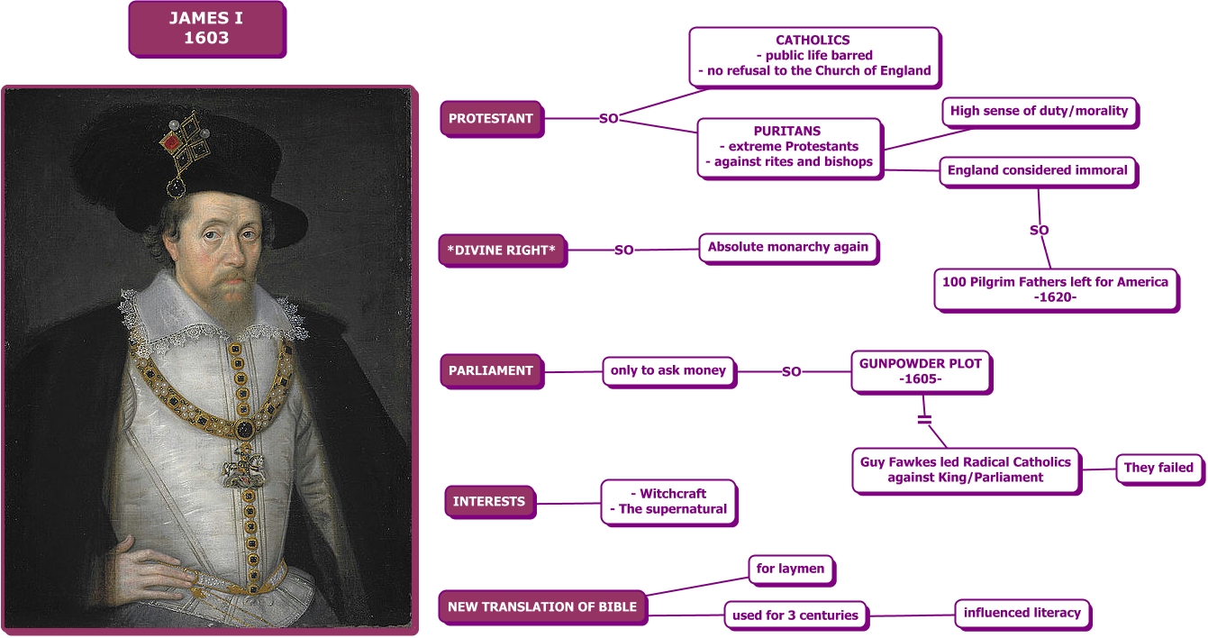 Questa Cmap, creata con IHMC CmapTools, contiene informazioni relative a: James I, NEW TRANSLATION OF BIBLE ???? for laymen, used for 3 centuries ???? influenced literacy, PURITANS - extreme Protestants - against rites and bishops ???? England considered immoral, PARLIAMENT ???? only to ask money, PURITANS - extreme Protestants - against rites and bishops ???? High sense of duty/morality, GUNPOWDER PLOT -1605- = Guy Fawkes led Radical Catholics against King/Parliament, *DIVINE RIGHT* SO Absolute monarchy again, England considered immoral SO 100 Pilgrim Fathers left for America -1620-, Guy Fawkes led Radical Catholics against King/Parliament ???? They failed, INTERESTS ???? - Witchcraft - The supernatural, NEW TRANSLATION OF BIBLE ???? used for 3 centuries, PROTESTANT SO PURITANS - extreme Protestants - against rites and bishops, only to ask money SO GUNPOWDER PLOT -1605-, PROTESTANT SO CATHOLICS - public life barred - no refusal to the Church of England