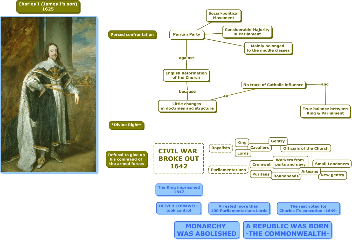 Questa Cmap, creata con IHMC CmapTools, contiene informazioni relative a: Charles I, Little changes in doctrines and structure so No trace of Catholic influence, Puritan Party ???? Considerable Majority in Parliament, Puritan Party ???? Social-political Movement, No trace of Catholic influence and True balance between King & Parliament, English Reformation of the Church because Little changes in doctrines and structure, Puritan Party against English Reformation of the Church, Puritan Party ???? ????