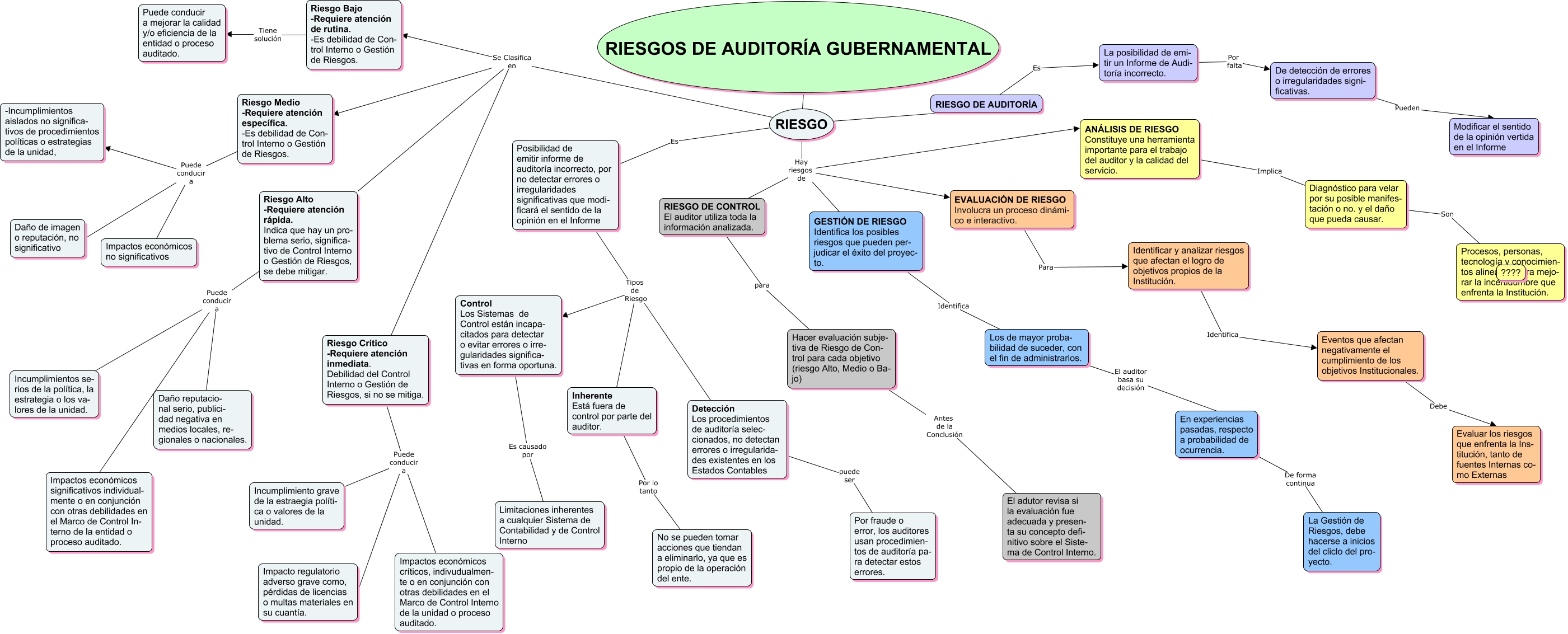 Este Cmap, tiene información relacionada con: RIESGOS DE AUDITORÍA GUBERNAMENTAL, Inherente Está fuera de control por parte del auditor. Por lo tanto No se pueden tomar acciones que tiendan a eliminarlo, ya que es propio de la operación del ente., La posibilidad de emi- tir un Informe de Audi- toría incorrecto. Por falta De detección de errores o irregularidades signi- ficativas., RIESGO ???? RIESGO DE AUDITORÍA, Riesgo Medio -Requiere atención específica. -Es debilidad de Con- trol Interno o Gestión de Riesgos. Puede conducir a Impactos económicos no significativos, Identificar y analizar riesgos que afectan el logro de objetivos propios de la Institución. Identifica Eventos que afectan negativamente el cumplimiento de los objetivos Institucionales., Riesgo Medio -Requiere atención específica. -Es debilidad de Con- trol Interno o Gestión de Riesgos. Puede conducir a Daño de imagen o reputación, no significativo, GESTIÓN DE RIESGO Identifica los posibles riesgos que pueden per- judicar el éxito del proyec- to. Identifica Los de mayor proba- bilidad de suceder, con el fin de administrarlos., De detección de errores o irregularidades signi- ficativas. Pueden Modificar el sentido de la opinión vertida en el Informe, Riesgo Crítico -Requiere atención inmediata. Debilidad del Control Interno o Gestión de Riesgos, si no se mitiga. Puede conducir a Incumplimiento grave de la estraegia políti- ca o valores de la unidad., Posibilidad de emitir informe de auditoría incorrecto, por no detectar errores o irregularidades significativas que modi- ficará el sentido de la opinión en el Informe Tipos de Riesgo Inherente Está fuera de control por parte del auditor., RIESGOS DE AUDITORÍA GUBERNAMENTAL ???? RIESGO, Riesgo Crítico -Requiere atención inmediata. Debilidad del Control Interno o Gestión de Riesgos, si no se mitiga. Puede conducir a Impactos económicos críticos, indivudualmen- te o en conjunción con otras debilidades en el Marco de Control Interno de la unidad o proceso auditado., Riesgo Medio -Requiere atención específica. -Es debilidad de Con- trol Interno o Gestión de Riesgos. Puede conducir a -Incumplimientos aislados no significa- tivos de procedimientos políticas o estrategias de la unidad,, RIESGO Hay riesgos de RIESGO DE CONTROL El auditor utiliza toda la información analizada., En experiencias pasadas, respecto a probabilidad de ocurrencia. De forma continua La Gestión de Riesgos, debe hacerse a inicios del cliclo del pro- yecto., Riesgo Alto -Requiere atención rápida. Indica que hay un pro- blema serio, significa- tivo de Control Interno o Gestión de Riesgos, se debe mitigar. Puede conducir a Incumplimientos se- rios de la política, la estrategia o los va- lores de la unidad., RIESGO Es Posibilidad de emitir informe de auditoría incorrecto, por no detectar errores o irregularidades significativas que modi- ficará el sentido de la opinión en el Informe, RIESGO Se Clasifica en Riesgo Alto -Requiere atención rápida. Indica que hay un pro- blema serio, significa- tivo de Control Interno o Gestión de Riesgos, se debe mitigar., Control Los Sistemas de Control están incapa- citados para detectar o evitar errores o irre- gularidades significa- tivas en forma oportuna. Es causado por Limitaciones inherentes a cualquier Sistema de Contabilidad y de Control Interno, Riesgo Crítico -Requiere atención inmediata. Debilidad del Control Interno o Gestión de Riesgos, si no se mitiga. Puede conducir a Impacto regulatorio adverso grave como, pérdidas de licencias o multas materiales en su cuantía.