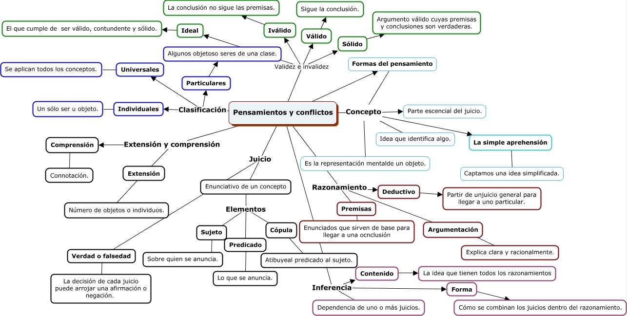 Este Cmap, tiene información relacionada con: Pensamientos-conflictos, Sólido ???? Argumento válido cuyas premisas y conclusiones son verdaderas., Pensamientos y conflictos Validez e invalidez Iválido, Universales ???? Se aplican todos los conceptos., Predicado ???? Lo que se anuncia., Iválido ???? La conclusión no sigue las premisas., Pensamientos y conflictos Concepto La simple aprehensión, Pensamientos y conflictos Inferencia Forma, Pensamientos y conflictos Inferencia Dependencia de uno o más juicios., Pensamientos y conflictos Razonamiento Premisas, Pensamientos y conflictos Razonamiento Argumentación, Pensamientos y conflictos Clasificación Particulares, Individuales Un sólo ser u objeto., Extensión ???? Número de objetos o individuos., Particulares Algunos objetoso seres de una clase., Pensamientos y conflictos Extensión y comprensión Comprensión, Pensamientos y conflictos Concepto Es la representación mentalde un objeto., Pensamientos y conflictos Concepto Idea que identifica algo., Pensamientos y conflictos Extensión y comprensión Extensión, Válido ???? Sigue la conclusión., Pensamientos y conflictos Clasificación Individuales
