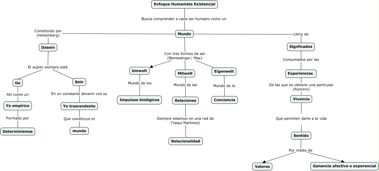 Este Cmap, tiene información relacionada con: Mapa conceptual Enfoque Humanista Existencial, Yo empírico Formado por Determinismos, Sein En un constante devenir con su Yo trascendente, Dasein El sujeto siempre está Da, Relaciones Siempre estamos en una red de (Yaqui Martinez) Relacionalidad, Experiencias De las que se obtiene una particular (Romero) Vivencia, Yo trascendente Que constituye el mundo, Da Ahí como un Yo empírico, Umwelt Mundo de los Impulsos biológicos, Sentido Por medio de Ganancia afectiva o experencial, Mundo Con tres formas de ser (Benswanger; May) Eigenwelt, Mundo Constituido por (Heisenberg) Dasein, Mundo Con tres formas de ser (Benswanger; May) Mitwelt, Mitwelt Mundo de las Relaciones, Mundo Con tres formas de ser (Benswanger; May) Umwelt, Eigenwelt Mundo de la Conciencia, Enfoque Humanista Existencial Busca comprender a cada ser humano como un Mundo, Sentido Por medio de Valores, Dasein El sujeto siempre está Sein, Mundo Lleno de Signficados, Vivencia Que permiten darle a la vida Sentido