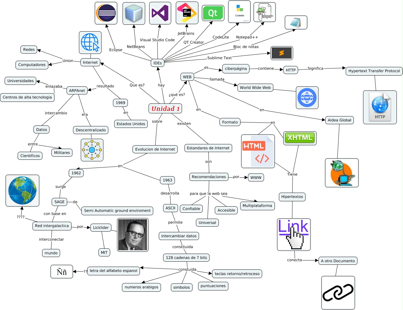 This Concept Map, created with IHMC CmapTools, has information related to: MapaMentalUnidad1, Recomendaciones para que la web sea Accesible, Hipertextos, Aldea Global ????, Datos entre Cientificos, World Wide Web, 128 cadenas de 7 bits constuida puntuaciones, Evolucion de Internet en 1962, 1963 desarrolla ASCII, Red intergalactica ????, ciberpágina contiene HTTP, IDEs JetBrains, Recomendaciones por WWW, Red intergalactica interconectar mundo, 1969 en Estados Unidos, Internet resultado ARPAnet, Internet resultado 1969, ASCII permite intercambiar datos, WEB llamada World Wide Web, SAGE de Semi Automatic ground enviroment, IDEs Bloc de notas