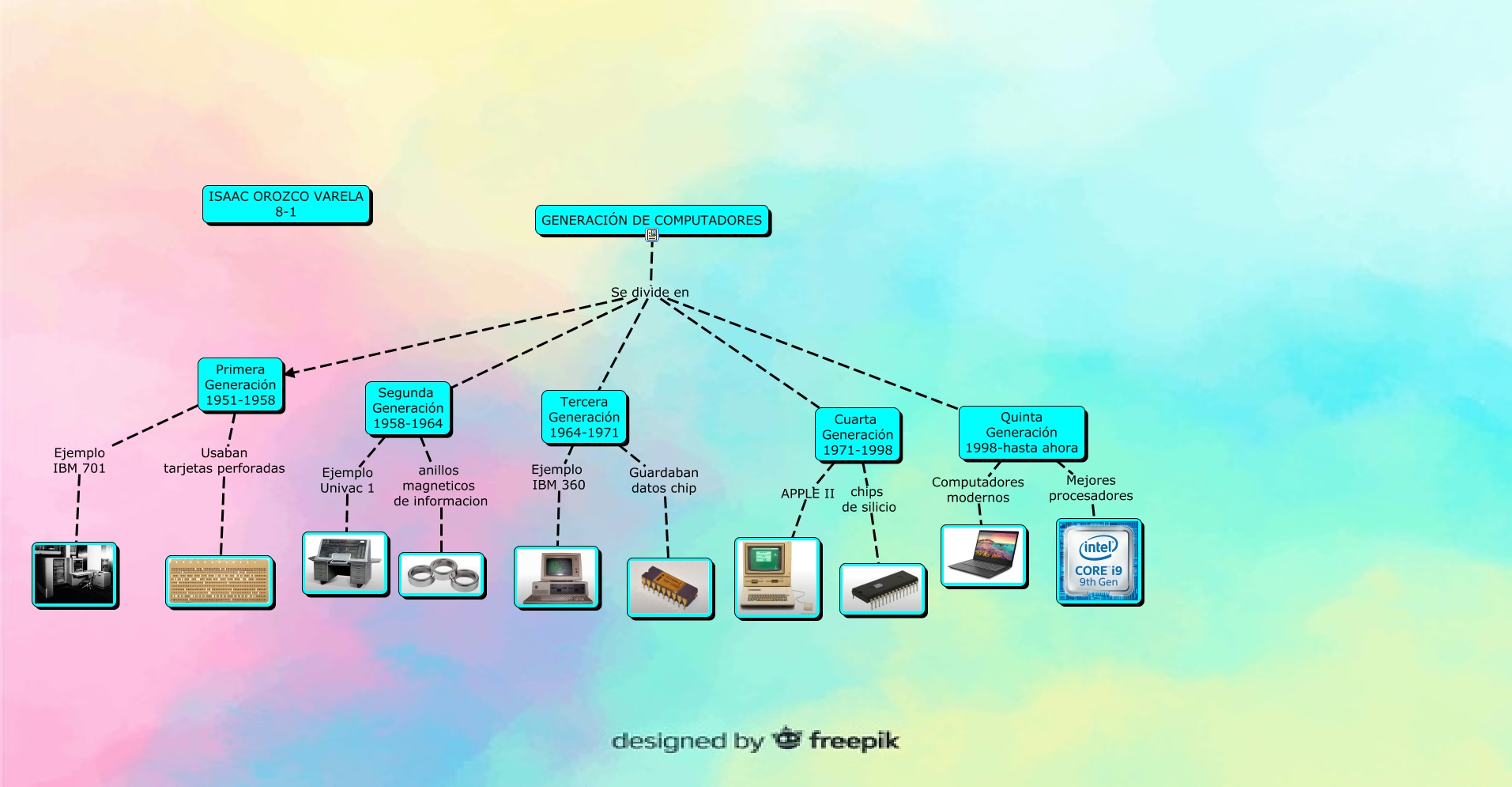 Este Cmap, tiene información relacionada con: GENERACIÓN DE COMPUTADORES, GENERACIÓN DE COMPUTADORES Se divide en Quinta Generación 1998-hasta ahora, Primera Generación 1951-1958 Ejemplo IBM 701, GENERACIÓN DE COMPUTADORES Se divide en Cuarta Generación 1971-1998, Quinta Generación 1998-hasta ahora Computadores modernos, GENERACIÓN DE COMPUTADORES Se divide en Primera Generación 1951-1958, Segunda Generación 1958-1964 anillos magneticos de informacion, GENERACIÓN DE COMPUTADORES Se divide en Tercera Generación 1964-1971, Cuarta Generación 1971-1998 APPLE II, Primera Generación 1951-1958 Usaban tarjetas perforadas, Tercera Generación 1964-1971 Guardaban datos chip, GENERACIÓN DE COMPUTADORES Se divide en Segunda Generación 1958-1964, Segunda Generación 1958-1964 Ejemplo Univac 1, Tercera Generación 1964-1971 Ejemplo IBM 360, Quinta Generación 1998-hasta ahora Mejores procesadores, Cuarta Generación 1971-1998 chips de silicio