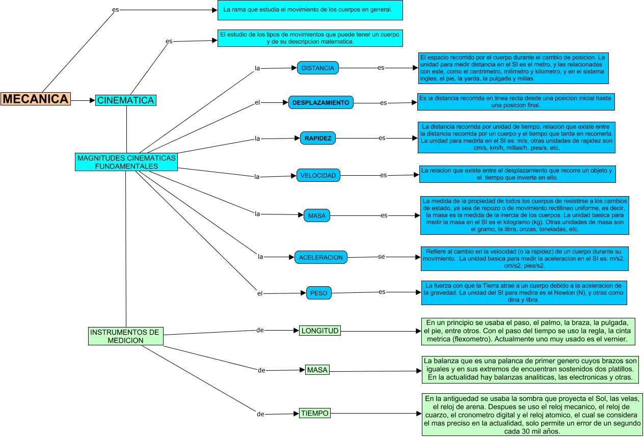 Este Cmap, tiene información relacionada con: MECANICA E1 SEGUNDO SEMESTRE, MAGNITUDES CINEMATICAS FUNDAMENTALES la DISTANCIA, MAGNITUDES CINEMATICAS FUNDAMENTALES ???? INSTRUMENTOS DE MEDICION, MAGNITUDES CINEMATICAS FUNDAMENTALES el DESPLAZAMIENTO, MASA ???? La balanza que es una palanca de primer genero cuyos brazos son iguales y en sus extremos de encuentran sostenidos dos platillos. En la actualidad hay balanzas analiticas, las electronicas y otras., MECANICA es La rama que estudia el movimiento de los cuerpos en general., ACELERACION se Refiere al cambio en la velocidad (o la rapidez) de un cuerpo durante su movimiento. La unidad basica para medir la aceleracion en el SI es: m/s2, cm/s2, pies/s2., TIEMPO ???? En la antiguedad se usaba la sombra que proyecta el Sol, las velas, el reloj de arena. Despues se uso el reloj mecanico, el reloj de cuarzo, el cronometro digital y el reloj atomico, el cual se considera el mas preciso en la actualidad, solo permite un error de un segundo cada 30 mil años., RAPIDEZ es La distancia recorrida por unidad de tiempo, relacion que existe entre la distancia recorrida por un cuerpo y el tiempo que tarda en recorrerla. La unidad para medirla en el SI es: m/s, otras unidades de rapidez son cm/s, km/h, millas/h, pies/s, etc., CINEMATICA es El estudio de los tipos de movimientos que puede tener un cuerpo y de su descripcion matematica., MECANICA ???? CINEMATICA, PESO es La fuerza con que la Tierra atrae a un cuerpo debido a la aceleracion de la gravedad. La unidad del SI para medira es el Newton (N), y otras como dina y libra., INSTRUMENTOS DE MEDICION de LONGITUD, INSTRUMENTOS DE MEDICION de TIEMPO, MAGNITUDES CINEMATICAS FUNDAMENTALES el PESO, MASA es La medida de la propiedad de todos los cuerpos de resistirse a los cambios de estado, ya sea de repozo o de movimiento rectilineo uniforme, es decir, la masa es la medida de la inercia de los cuerpos. La unidad basica para medir la masa en el SI es el kilogramo (kg). Otras unidades de masa son el gramo, la libra, onzas, toneladas, etc., CINEMATICA ???? MAGNITUDES CINEMATICAS FUNDAMENTALES, DISTANCIA es El espacio recorrido por el cuerpo durante el cambio de posicion. La unidad para medir distancia en el SI es el metro, y las relacionadas con este, como el centrimetro, milimetro y kilometro, y en el sistema ingles, el pie, la yarda, la pulgada y millas., INSTRUMENTOS DE MEDICION de MASA, MAGNITUDES CINEMATICAS FUNDAMENTALES la MASA, MAGNITUDES CINEMATICAS FUNDAMENTALES la RAPIDEZ