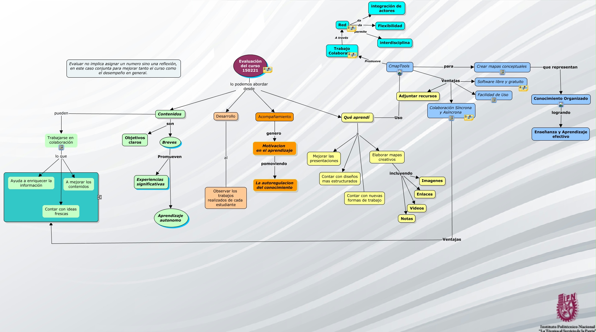 Este Cmap, tiene información relacionada con: Evaluaciòn_03, Contenidos son Objetivos claros, Crear mapas conceptuales que representan Conocimiento Organizado, Desarrollo al Observar los trabajos realizados de cada estudiante, CmapTools Promueve Trabajo Colaborativo, Elaborar mapas creativos incluyendo Imagenes, Elaborar mapas creativos incluyendo Enlaces, Qué aprendí a Mejorar las presentaciones, Motivacion en el aprendizaje pomoviendo La autoregulacion del conocimiento, Breves Promueven Aprendizaje autonomo, Colaboración Síncrona y Asíncrona Ventajas ????, Red da integración de actores, Qué aprendí a Contar con diseños mas estructurados, Red da Flexibilidad, Evaluaciòn del curso 150221 lo podemos abordar desde Acompañamiento, Trabajo Colaborativo A través Red, Trabajarse en colaboración lo que Ayuda a enriquecer la información, Trabajarse en colaboración lo que Contar con ideas frescas, CmapTools Ventajas Colaboración Síncrona y Asíncrona, Breves Promueven Experiencias significativas, Qué aprendí a Contar con nuevas formas de trabajo