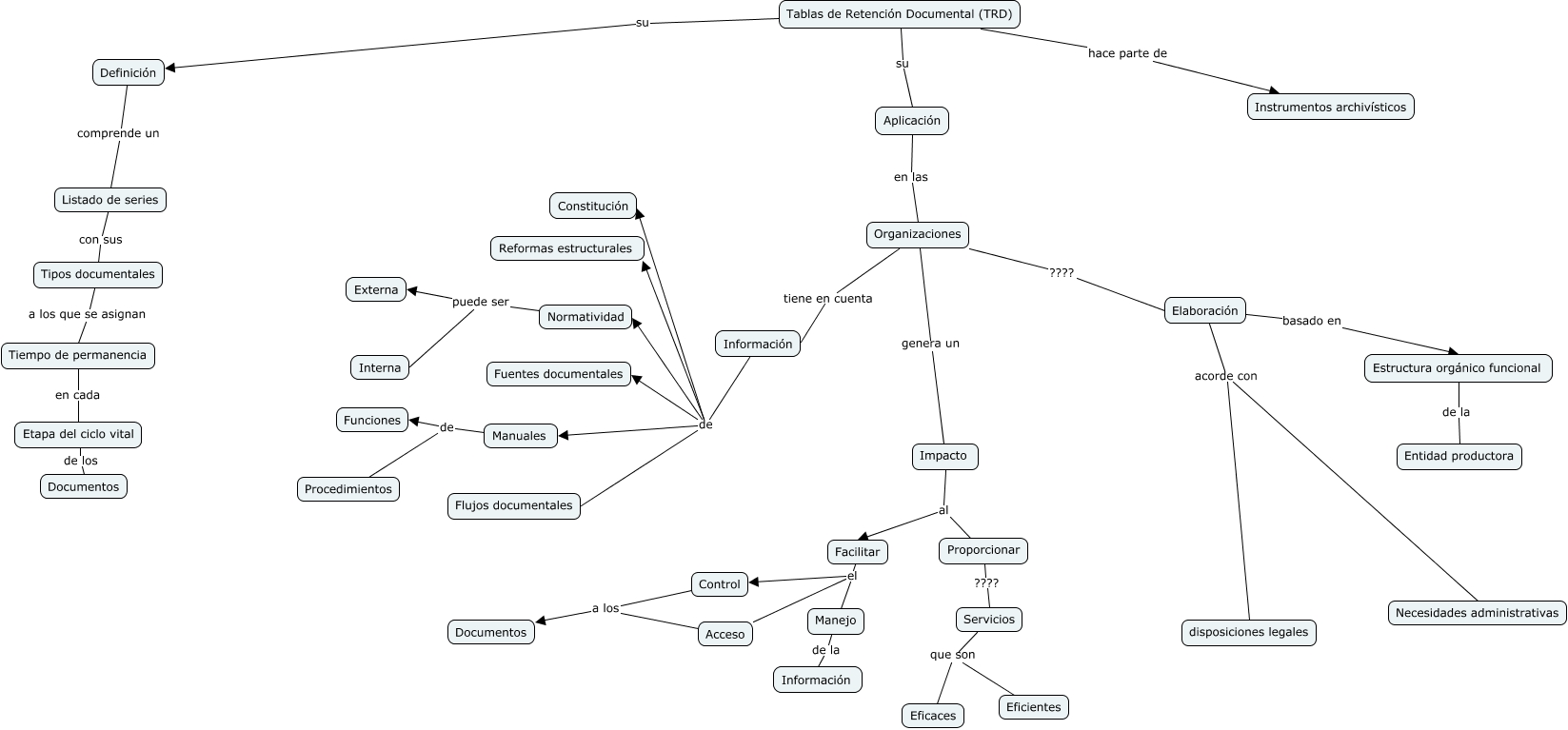 Este Cmap, tiene información relacionada con: TRD, Tablas de Retención Documental (TRD) su Aplicación, Normatividad puede ser Externa, Manuales de Funciones, Información de Manuales, Elaboración acorde con Necesidades administrativas, Información de Reformas estructurales, Proporcionar ???? Servicios, Organizaciones genera un Impacto, Tipos documentales a los que se asignan Tiempo de permanencia, Tablas de Retención Documental (TRD) su Definición, Definición comprende un Listado de series, Estructura orgánico funcional de la Entidad productora, Información de Normatividad, Normatividad puede ser Interna, Manuales de Procedimientos, Servicios que son Eficientes, Facilitar el Acceso, Servicios que son Eficaces, Control a los Documentos, Facilitar el Manejo