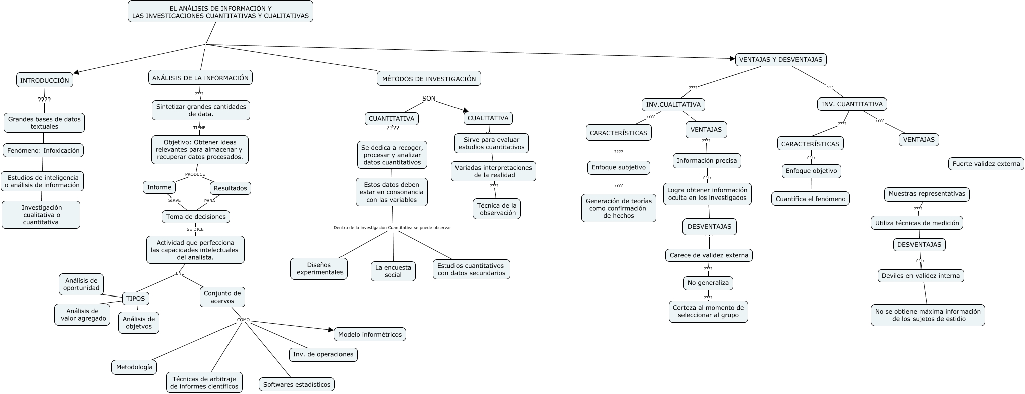 Este Cmap, tiene información relacionada con: ESTO ES x2, No generaliza ???? Certeza al momento de seleccionar al grupo, INV. CUANTITATIVA ???? VENTAJAS, Estos datos deben estar en consonancia con las variables Dentro de la investigación Cuantitativa se puede observar Diseños experimentales, Estos datos deben estar en consonancia con las variables Dentro de la investigación Cuantitativa se puede observar Estudios cuantitativos con datos secundarios, Estos datos deben estar en consonancia con las variables Dentro de la investigación Cuantitativa se puede observar La encuesta social, MÉTODOS DE INVESTIGACIÓN VENTAJAS Y DESVENTAJAS, TIPOS Análisis de objetvos, Toma de decisiones SE DICE Actividad que perfecciona las capacidades intelectuales del analista., Variadas interpretaciones de la realidad ???? Técnica de la observación, CUANTITATIVA ???? Se dedica a recoger, procesar y analizar datos cuantitativos, Fenómeno: Infoxicación ???? Estudios de inteligencia o análisis de información, INV.CUALITATIVA ???? CARACTERÍSTICAS, MÉTODOS DE INVESTIGACIÓN ANÁLISIS DE LA INFORMACIÓN, Información precisa ???? DESVENTAJAS, EL ANÁLISIS DE INFORMACIÓN Y LAS INVESTIGACIONES CUANTITATIVAS Y CUALITATIVAS INTRODUCCIÓN, Objetivo: Obtener ideas relevantes para almacenar y recuperar datos procesados. PRODUCE Resultados, DESVENTAJAS ???? Carece de validez externa, VENTAJAS Y DESVENTAJAS ???? INV.CUALITATIVA, Conjunto de acervos COMO Metodología, Conjunto de acervos COMO Modelo informétricos