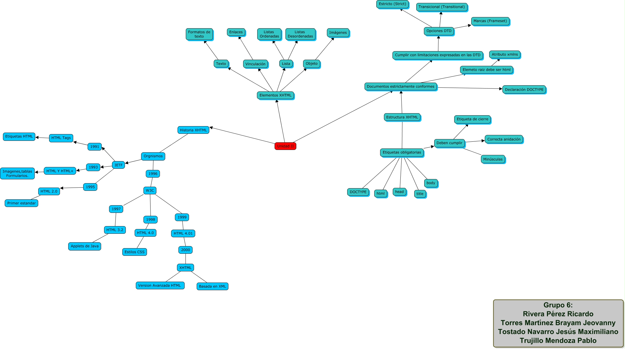 Este Cmap, tiene información relacionada con: MM_equipo6_unidad2, 2000 XHTML, XHTML Version Avanzada HTML, Elemeto raiz debe ser html Atributo xmlns, IETF 1995, Etiquetas obligatorias DOCTYPE, Vinculación Enlaces, Lista Listas Desordenadas, 1997 HTML 3.2, Documentos estrictamente conformes Declaración DOCTYPE, HTML 4.01 2000, Etiquetas obligatorias head, W3C 1997, Etiquetas obligatorias body, HTML Y HTML+ Imagenes,tablas Formularios., 1999 HTML 4.01, Elementos XHTML Objeto, IETF 1993, Etiquetas obligatorias title, 1995 HTML 2.0, XHTML Basada en XML