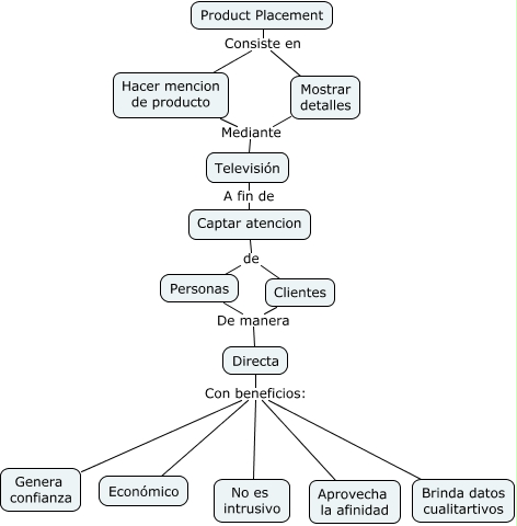Este Cmap, tiene información relacionada con: 2 Product placement, Directa Con beneficios: Aprovecha la afinidad, Hacer mencion de producto Mediante Televisión, Directa Con beneficios: Económico, Product Placement Consiste en Mostrar detalles, Clientes De manera Directa, Mostrar detalles Mediante Televisión, Directa Con beneficios: Brinda datos cualitartivos, Captar atencion de Clientes, Televisión A fin de Captar atencion, Directa Con beneficios: Genera confianza, Product Placement Consiste en Hacer mencion de producto, Personas De manera Directa, Directa Con beneficios: No es intrusivo, Captar atencion de Personas