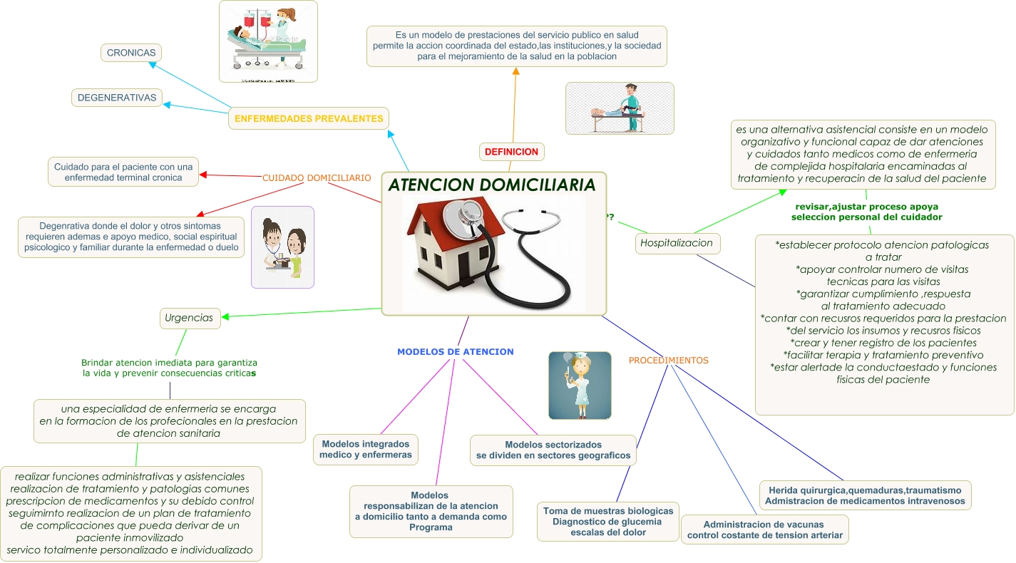 Este Cmap, tiene información relacionada con: Copia (2) de Copia de L ATENCION DOMICILIARIA, Hospitalizacion ???? es una alternativa asistencial consiste en un modelo organizativo y funcional capaz de dar atenciones y cuidados tanto medicos como de enfermeria de complejida hospitalaria encaminadas al tratamiento y recuperacin de la salud del paciente, es una alternativa asistencial consiste en un modelo organizativo y funcional capaz de dar atenciones y cuidados tanto medicos como de enfermeria de complejida hospitalaria encaminadas al tratamiento y recuperacin de la salud del paciente revisar,ajustar proceso apoya seleccion personal del cuidador *establecer protocolo atencion patologicas a tratar *apoyar controlar numero de visitas tecnicas para las visitas *garantizar cumplimiento ,respuesta al tratamiento adecuado *contar con recusros requeridos para la prestacion *del servicio los insumos y recusros fisicos *crear y tener registro de los pacientes *facilitar terapia y tratamiento preventivo *estar alertade la conductaestado y funciones fisicas del paciente, ATENCION DOMICILIARIA MODELOS DE ATENCION Modelos responsabilizan de la atencion a domicilio tanto a demanda como Programa, Hospitalizacion ???? ????, ATENCION DOMICILIARIA PROCEDIMIENTOS Administracion de vacunas control costante de tension arteriar, ATENCION DOMICILIARIA PROCEDIMIENTOS Toma de muestras biologicas Diagnostico de glucemia escalas del dolor, ATENCION DOMICILIARIA MODELOS DE ATENCION Modelos integrados medico y enfermeras, ATENCION DOMICILIARIA ???? Es un modelo de prestaciones del servicio publico en salud permite la accion coordinada del estado,las instituciones,y la sociedad para el mejoramiento de la salud en la poblacion, ATENCION DOMICILIARIA ???? Urgencias, ENFERMEDADES PREVALENTES ???? DEGENERATIVAS, ATENCION DOMICILIARIA CUIDADO DOMICILIARIO Cuidado para el paciente con una enfermedad terminal cronica, ATENCION DOMICILIARIA ???? Hospitalizacion, una especialidad de enfermeria se encarga en la formacion de los profecionales en la prestacion de atencion sanitaria ???? realizar funciones administrativas y asistenciales realizacion de tratamiento y patologias comunes prescripcion de medicamentos y su debido control seguimirnto realizacion de un plan de tratamiento de complicaciones que pueda derivar de un paciente inmovilizado servico totalmente personalizado e individualizado, ENFERMEDADES PREVALENTES ???? CRONICAS, ATENCION DOMICILIARIA PROCEDIMIENTOS Herida quirurgica,quemaduras,traumatismo Admistracion de medicamentos intravenosos, Urgencias Brindar atencion imediata para garantiza la vida y prevenir consecuencias criticas una especialidad de enfermeria se encarga en la formacion de los profecionales en la prestacion de atencion sanitaria, ATENCION DOMICILIARIA MODELOS DE ATENCION Modelos sectorizados se dividen en sectores geograficos, ATENCION DOMICILIARIA CUIDADO DOMICILIARIO Degenrativa donde el dolor y otros sintomas requieren ademas e apoyo medico, social espiritual psicologico y familiar durante la enfermedad o duelo, ATENCION DOMICILIARIA ???? ENFERMEDADES PREVALENTES