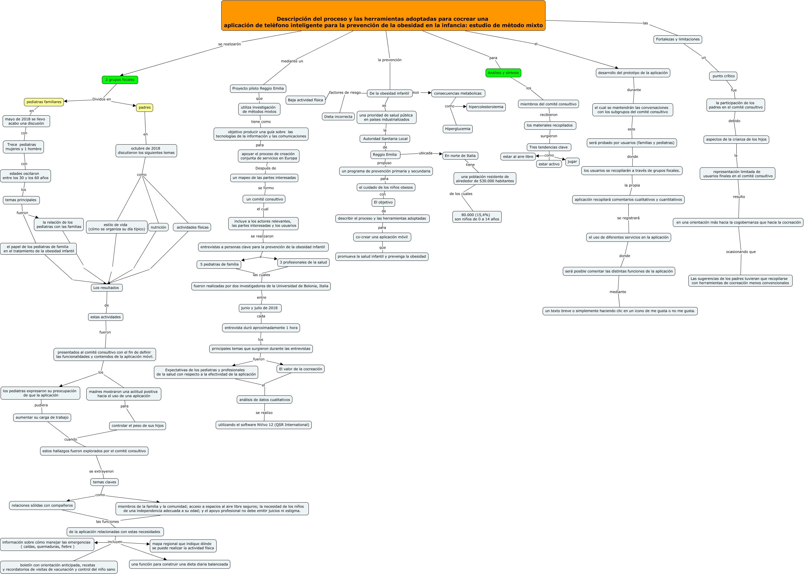 Este Cmap, tiene información relacionada con: reading, mayo de 2018 se llevo acabo una discusión con Trece pediatras mujeres y 1 hombre, Tres tendencias clave como estar activo, apoyar el proceso de creación conjunta de servicios en Europa Después de un mapeo de las partes interesadas, la relación de los pediatras con las familias Los resultados, Proyecto piloto Reggio Emilia que utiliza investigación de métodos mixtos, describir el proceso y las herramientas adoptadas para co-crear una aplicación móvil, Autoridad Sanitaria Local de Reggio Emilia, Los resultados de estas actividades, miembros de la familia y la comunidad; acceso a espacios al aire libre seguros; la necesidad de los niños de una independencia adecuada a su edad; y el apoyo profesional no debe emitir juicios ni estigma. las funciones de la aplicación relacionadas con estas necesidades, entrevistas a personas clave para la prevención de la obesidad infantil a 3 profesionales de la salud, estos hallazgos fueron explorados por el comité consultivo se extrayeron temas claves, la participación de los padres en el comité consultivo debido aspectos de la crianza de los hijos, 3 profesionales de la salud las cuales fueron realizadas por dos investigadores de la Universidad de Bolonia, Italia, el uso de diferentes servicios en la aplicación donde será posible comentar las distintas funciones de la aplicación, una prioridad de salud pública en países industrializados la Autoridad Sanitaria Local, Descripción del proceso y las herramientas adoptadas para cocrear una aplicación de teléfono inteligente para la prevención de la obesidad en la infancia: estudio de método mixto para Análisis y síntesis, de la aplicación relacionadas con estas necesidades incluyen mapa regional que indique dónde se puede realizar la actividad física, análisis de datos cualitativos se realizo utilizando el software NVivo 12 (QSR International), temas claves como miembros de la familia y la comunidad; acceso a espacios al aire libre seguros; la necesidad de los niños de una independencia adecuada a su edad; y el apoyo profesional no debe emitir juicios ni estigma., Descripción del proceso y las herramientas adoptadas para cocrear una aplicación de teléfono inteligente para la prevención de la obesidad en la infancia: estudio de método mixto mediante un Proyecto piloto Reggio Emilia