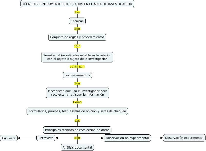 Este Cmap, tiene información relacionada con: TALLER INVESTIGACIÓN-MAPA, Conjunto de reglas y procedimientos Que Permiten al investigador establecer la relación con el objeto o sujeto de la investigación, Principales técnicas de recolección de datos Son Observación experimental, Principales técnicas de recolección de datos Son Observación no experimental, Formularios, pruebas, test, escalas de opinión y listas de chequeo Las Principales técnicas de recolección de datos, Principales técnicas de recolección de datos Son Análisis documental, TÉCNICAS E INTRUMENTOS UTILIZADOS EN EL ÁREA DE INVESTIGACIÓN Las Técnicas, Los instrumentos Son Mecanismo que usa el investigador para recolectar y registrar la información, Técnicas Son Conjunto de reglas y procedimientos, Mecanismo que usa el investigador para recolectar y registrar la información Como Formularios, pruebas, test, escalas de opinión y listas de chequeo, Permiten al investigador establecer la relación con el objeto o sujeto de la investigación Junto con Los instrumentos, Principales técnicas de recolección de datos Son Encuesta, Principales técnicas de recolección de datos Son Entrevista