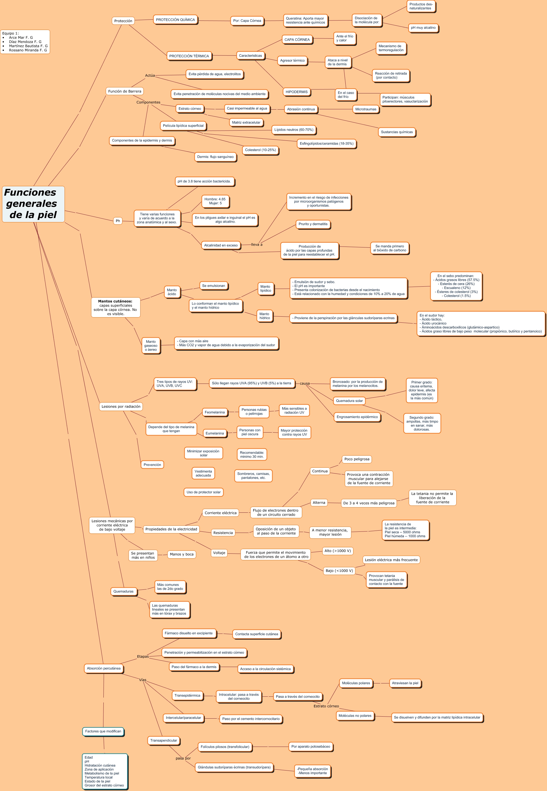 Este Cmap, tiene información relacionada con: Funciones generales de la piel, Quemadura solar Primer grado: causa eritema, dolor leve, afecta epidermis (es la más común), Lesiones por radiación Tres tipos de rayos UV: UVA, UVB, UVC, Lo conforman el manto lipídico y el manto hídrico Manto lipídico, Sólo llegan rayos UVA (95%) y UVB (5%) a la tierra causa Bronceado: por la producción de melanina por los melanocitos., - Proviene de la perspiración por las glánculas sudoríparas ecrinas En el sudor hay: - Ácido láctico, - Ácido urocánico - Áminoácidos descarboxilicos (glutámico-aspartico) - Ácidos graso libres de bajo peso molecular (propiónico, butírico y pentanoico), - Emulsión de sudor y sebo. - El pH es importante - Presenta colonización de bacterias desde el nacimiento - Está relacionado con la humedad y condiciones de 10% a 20% de agua ???? En el sebo predominan: - Ácidos grasos libres (57.5%) - Esterés de cera (26%) - Escualeno (12%) - Ésteres de colesterol (3%) - Colesterol (1.5%), Depende del tipo de melanina que tengan ???? Eumelanina, Factores que modifican Edad pH Hidratación cutánea Zona de aplicación Metabolismo de la piel Temperatura local Estado de la piel Grosor del estrato córneo, Lo conforman el manto lipídico y el manto hídrico ???? Manto hídrico, Manto hídrico ???? - Proviene de la perspiración por las glánculas sudoríparas ecrinas, Continua Provoca una contracción muscular para alejarse de la fuente de corriente, Transapendicular pasa por Glándulas sudoríparas écrinas (transudorípara), Resistencia Oposición de un objeto al paso de la corriente, Bajo ( V) Provocan tetania muscular y parálisis de contacto con la fuente, Lesiones mecánicas por corriente eléctrica de bajo voltaje Se presentan más en niños, Propiedades de la electricidad Resistencia, Producción de ácido por las capas profundas de la piel para reestablecer el pH. ???? Se manda primero al bióxido de carbono, Fuerza que permite el movimiento de los electrones de un átomo a otro ???? Alto ( V), Lesiones mecánicas por corriente eléctrica de bajo voltaje Quemaduras, Sólo llegan rayos UVA (95%) y UVB (5%) a la tierra causa Quemadura solar