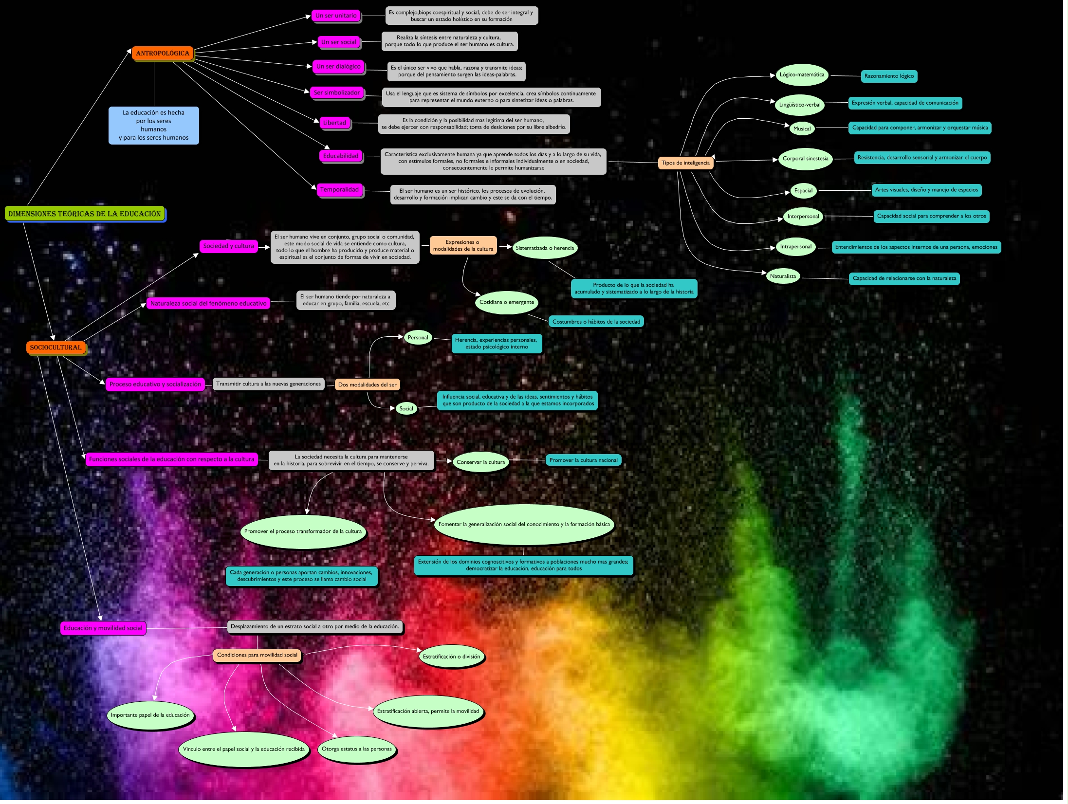 Este Cmap, tiene información relacionada con: Tarea 1, Transmitir cultura a las nuevas generaciones ???? Dos modalidades del ser, Corporal sinestesia ???? Resistencia, desarrollo sensorial y armonizar el cuerpo, Característica exclusivamente humana ya que aprende todos los días y a lo largo de su vida, con estímulos formales, no formales e informales individualmente o en sociedad, consecuentemente le permite humanizarse ???? Tipos de inteligencia, DIMENSIONES TEÓRICAS DE LA EDUCACIÓN ???? Sociocultural, Un ser unitario ???? Es complejo,biopsicoespiritual y social, debe de ser integral y buscar un estado holístico en su formación, Musical ???? Capacidad para componer, armonizar y orquestar música, Espacial ???? Artes visuales, diseño y manejo de espacios, Naturaleza social del fenómeno educativo ???? El ser humano tiende por naturaleza a educar en grupo, familia, escuela, etc, Educación y movilidad social ???? Desplazamiento de un estrato social a otro por medio de la educación., Antropológica ???? Un ser dialógico, Educabilidad ???? Característica exclusivamente humana ya que aprende todos los días y a lo largo de su vida, con estímulos formales, no formales e informales individualmente o en sociedad, consecuentemente le permite humanizarse, La sociedad necesita la cultura para mantenerse en la historia, para sobrevivir en el tiempo, se conserve y perviva. ???? Fomentar la generalización social del conocimiento y la formación básica, Condiciones para movilidad social ???? Vinculo entre el papel social y la educación recibida, Antropológica ???? Libertad, Un ser social ???? Realiza la síntesis entre naturaleza y cultura, porque todo lo que produce el ser humano es cultura., Un ser dialógico ???? Es el único ser vivo que habla, razona y transmite ideas; porque del pensamiento surgen las ideas-palabras., Temporalidad ???? El ser humano es un ser histórico, los procesos de evolución, desarrollo y formación implican cambio y este se da con el tiempo., Tipos de inteligencia ???? Musical, Antropológica ???? Ser simbolizador, Funciones sociales de la educación con respecto a la cultura ???? La sociedad necesita la cultura para mantenerse en la historia, para sobrevivir en el tiempo, se conserve y perviva.