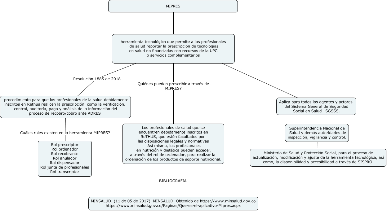 This Concept Map, created with IHMC CmapTools, has information related to: MIPRES, MIPRES ???? herramienta tecnológica que permite a los profesionales de salud reportar la prescripción de tecnologías en salud no financiadas con recursos de la UPC o servicios complementarios, herramienta tecnológica que permite a los profesionales de salud reportar la prescripción de tecnologías en salud no financiadas con recursos de la UPC o servicios complementarios ???? Aplica para todos los agentes y actores del Sistema General de Seguridad Social en Salud –SGSSS., procedimiento para que los profesionales de la salud debidamente inscritos en Rethus realicen la prescripción. como la verificación, control, auditoría, pago y análisis de la información del proceso de recobro/cobro ante ADRES Cuáles roles existen en la herramienta MIPRES? Rol prescriptor Rol ordenador Rol recobrante Rol anulador Rol dispensador Rol junta de profesionales Rol transcriptor, Aplica para todos los agentes y actores del Sistema General de Seguridad Social en Salud –SGSSS. ???? Superintendencia Nacional de Salud y demás autoridades de inspección, vigilancia y control., Los profesionales de salud que se encuentren debidamente inscritos en ReTHUS, que estén facultados por las disposiciones legales y normativas Así mismo, los profesionales en nutrición y dietética pueden acceder, a través del rol de ordenador, para realizar la ordenación de los productos de soporte nutricional. BIBLIOGRAFIA MINSALUD. (11 de 05 de 2017). MINSALUD. Obtenido de https://www.minsalud.gov.co https://www.minsalud.gov.co/Paginas/Que-es-el-aplicativo-Mipres.aspx, Superintendencia Nacional de Salud y demás autoridades de inspección, vigilancia y control. ???? Ministerio de Salud y Protección Social, para el proceso de actualización, modificación y ajuste de la herramienta tecnológica, así como, la disponibilidad y accesibilidad a través de SISPRO., herramienta tecnológica que permite a los profesionales de salud reportar la prescripción de tecnologías en salud no financiadas con recursos de la UPC o servicios complementarios Quiénes pueden prescribir a través de MIPRES? Los profesionales de salud que se encuentren debidamente inscritos en ReTHUS, que estén facultados por las disposiciones legales y normativas Así mismo, los profesionales en nutrición y dietética pueden acceder, a través del rol de ordenador, para realizar la ordenación de los productos de soporte nutricional., herramienta tecnológica que permite a los profesionales de salud reportar la prescripción de tecnologías en salud no financiadas con recursos de la UPC o servicios complementarios Resolución 1885 de 2018 procedimiento para que los profesionales de la salud debidamente inscritos en Rethus realicen la prescripción. como la verificación, control, auditoría, pago y análisis de la información del proceso de recobro/cobro ante ADRES
