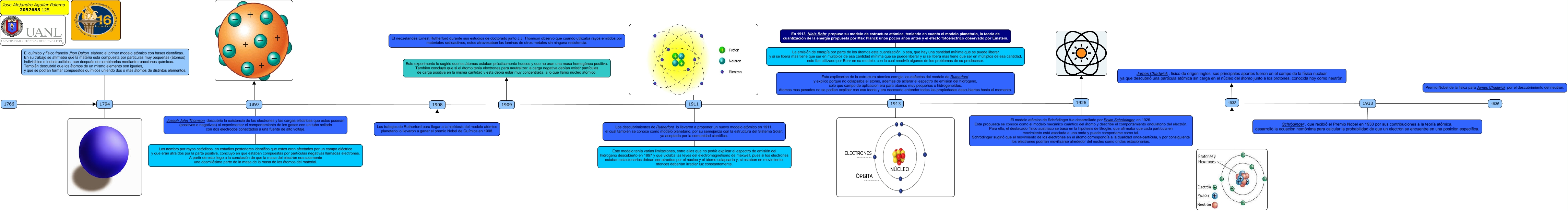 Este Cmap, tiene información relacionada con: Linea del tiempo, Premio Nobel de la fisica para James Chadwick por el descubrimiento del neutron. ???? 1935, El modelo atómico de Schrödinger fue desarrollado por Erwin Schrödinger en 1926. Esta propuesta se conoce como el modelo mecánico cuántico del átomo y describe el comportamiento ondulatorio del electrón. Para ello, el destacado físico austriaco se basó en la hipótesis de Broglie, que afirmaba que cada partícula en movimiento está asociada a una onda y puede comportarse como tal. Schrödinger sugirió que el movimiento de los electrones en el átomo correspondía a la dualidad onda-partícula, y por consiguiente los electrones podrían movilizarse alrededor del núcleo como ondas estacionarias. ????, En 1913, Niels Bohr propuso su modelo de estructura atómica, teniendo en cuenta el modelo planetario, la teoría de cuantización de la energía propuesta por Max Planck unos pocos años antes y el efecto fotoeléctrico observado por Einstein. ???? La emisión de energía por parte de los átomos esta cuantización, o sea, que hay una cantidad mínima que se puede liberar y si se libera mas tiene que ser en múltiplos de esa cantidad mínima que se puede liberar y si se libera mas tiene que ser en múltiplos de esa cantidad, esto fue utilizado por Bohr en su modelo, con lo cual resolvió algunos de los problemas de su predecesor., Joseph John Thomson descubrió la existencia de los electrones y las cargas eléctricas que estos poseían (positivas o negativas) al experimentar el comportamiento de los gases con un tubo sellado con dos electrodos conectados a una fuente de alto voltaje. ???? 1897, 1794 ???? El químico y físico francés Jhon Dalton elaboro el primer modelo atómico con bases científicas. En su trabajo se afirmaba que la materia esta compuesta por partículas muy pequeñas (átomos) indivisibles e indestructibles, aun después de combinarlas mediante reacciones químicas. También descubrió que los átomos de un mismo elemento son iguales, y que se podían formar compuestos químicos uniendo dos o mas átomos de distintos elementos., 1909 ???? Este experimento le sugirió que los átomos estaban prácticamente huecos y que no eran una masa homogénea positiva. También concluyó que si el átomo tenia electrones para neutralizar la carga negativa debían existir partículas de carga positiva en la misma cantidad y esta debía estar muy concentrada, a lo que llamo núcleo atómico., 1909 ???? 1911, Esta explicacion de la estructura atomica corrigio los defectos del modelo de Rutherford y explico porque no colapsaba el atomo, ademas de aclarar el espectro de emision del hidrogeno, solo que campo de aplicacion era para atomos muy pequeños o hidrogenoides. Atomos mas pesados no se podian explicar con esa teoria y era necesario entender todas las propiedades descubiertas hasta el momento. ???? 1913, 1794 ???? 1897, 1926 ???? El modelo atómico de Schrödinger fue desarrollado por Erwin Schrödinger en 1926. Esta propuesta se conoce como el modelo mecánico cuántico del átomo y describe el comportamiento ondulatorio del electrón. Para ello, el destacado físico austriaco se basó en la hipótesis de Broglie, que afirmaba que cada partícula en movimiento está asociada a una onda y puede comportarse como tal. Schrödinger sugirió que el movimiento de los electrones en el átomo correspondía a la dualidad onda-partícula, y por consiguiente los electrones podrían movilizarse alrededor del núcleo como ondas estacionarias., 1911 ???? Los descubrimientos de Rutherford lo llevaron a proponer un nuevo modelo atómico en 1911, el cual también se conoce como modelo planetario, por su semejanza con la estructura del Sistema Solar; ya aceptada por la comunidad científica., 1932 ???? James Chadwick, fisico de origen ingles, sus principales aportes fueron en el campo de la física nuclear ya que descubrió una partícula atómica sin carga en el núcleo del átomo junto a los protones, conocida hoy como neutrón., 1933 1935, Joseph John Thomson descubrió la existencia de los electrones y las cargas eléctricas que estos poseían (positivas o negativas) al experimentar el comportamiento de los gases con un tubo sellado con dos electrodos conectados a una fuente de alto voltaje. ???? Los nombro por rayos catódicos, en estudios posteriores identifico que estos eran afectados por un campo eléctrico y que eran atraídos por la parte positiva, concluyo en que estaban compuestas por partículas negativas llamadas electrones. A partir de esto llego a la conclusión de que la masa del electrón era solamente una dosmilésima parte de la masa de la masa de los átomos del material., Los trabajos de Rutherford para llegar a la hipótesis del modelo atómico planetario lo llevaron a ganar el premio Nobel de Química en 1908. ???? 1908, 1766 ???? 1794, 1897 ????, 1933 ???? Schrödinger, que recibió el Premio Nobel en 1933 por sus contribuciones a la teoría atómica, desarrolló la ecuación homónima para calcular la probabilidad de que un electrón se encuentre en una posición específica., ???? 1932, 1926 ???? 1932