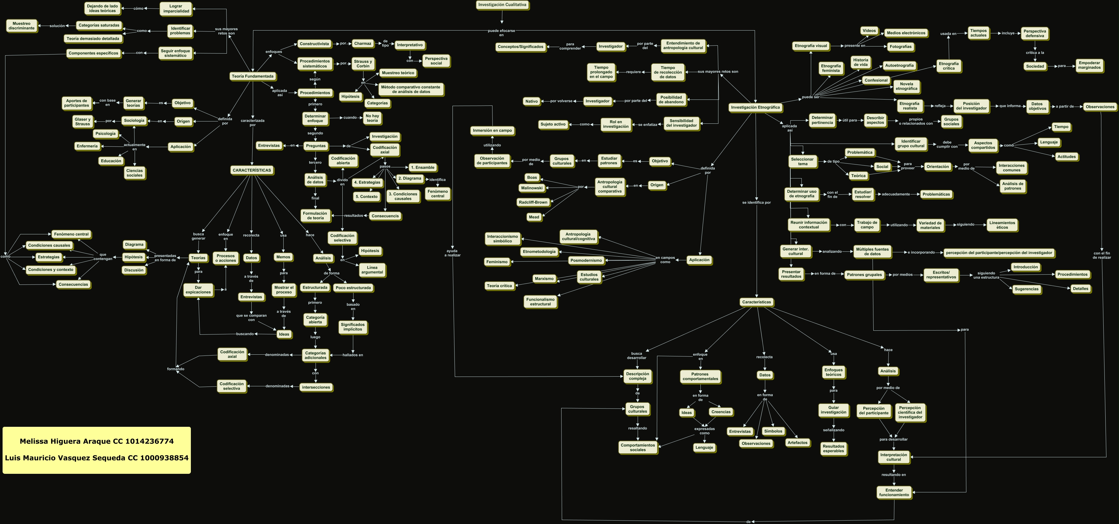 Este Cmap, tiene información relacionada con: Invest Fundamentada y Etnográfica, Codificación axial pasos 3. Condiciones causales, Teoría Fundamentada definida por Orígen, Escritos/ representativos siguiendo una estructura Sugerencias, Codificación axial pasos 1. Ensamble, Sociología por Glaser y Strauss, Preguntas de Investigación, Teoría Fundamentada definida por Objetivo, Percepción del participante para desarrollar Interpretación cultural, Múltiples fuentes de datos e incorporando percepción del participante/percepción del investigador, Aplicación actualmente en Educación, Constructivista por Charmaz, Características hace Análisis, Reunir información contextual con Trabajo de campo, Datos en forma de Entrevistas, Investigación Etnográfica aplicada así Seleccionar tema, Ideas expresadas como Lenguaje, Estructurada primero Categoría abierta, Teorías presentadas en forma de Discusión, Descripción compleja de Grupos culturales, Investigación Etnográfica sus mayores retos son Posibilidad de abandono