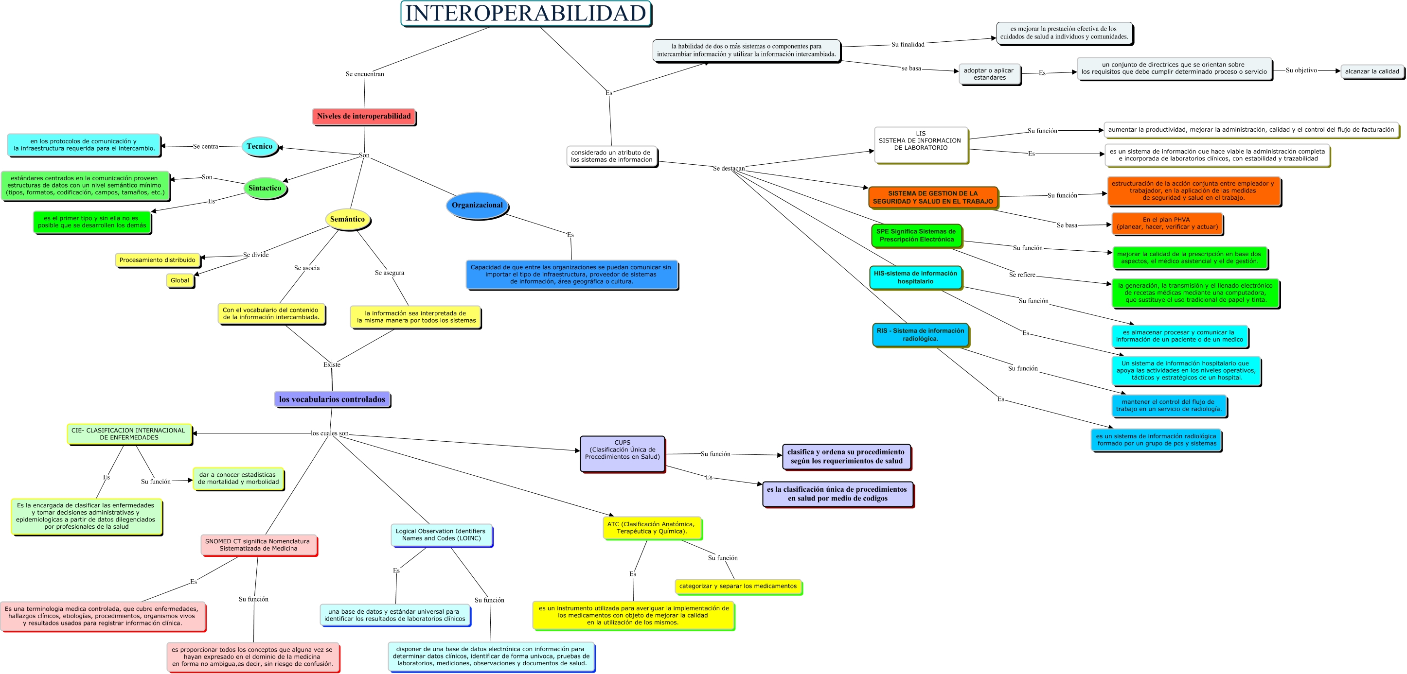 Este Cmap, tiene información relacionada con: Interoperabilidad, Niveles de interoperabilidad Son Semántico, Niveles de interoperabilidad Son Sintactico, considerado un atributo de los sistemas de informacion Se destacan HIS-sistema de información hospitalario, Semántico Se divide Global, adoptar o aplicar estandares Es un conjunto de directrices que se orientan sobre los requisitos que debe cumplir determinado proceso o servicio, HIS-sistema de información hospitalario Es Un sistema de información hospitalario que apoya las actividades en los niveles operativos, tácticos y estratégicos de un hospital., Semántico Se asocia Con el vocabulario del contenido de la información intercambiada., Semántico Se divide Procesamiento distribuido, SPE Significa Sistemas de Prescripción Electrónica Su función mejorar la calidad de la prescripción en base dos aspectos, el médico asistencial y el de gestión., RIS - Sistema de información radiológica. Su función mantener el control del flujo de trabajo en un servicio de radiología., CIE- CLASIFICACION INTERNACIONAL DE ENFERMEDADES Es Es la encargada de clasificar las enfermedades y tomar decisiones administrativas y epidemiologicas a partir de datos dilegenciados por profesionales de la salud, considerado un atributo de los sistemas de informacion Se destacan RIS - Sistema de información radiológica., Niveles de interoperabilidad Son Tecnico, HIS-sistema de información hospitalario Su función es almacenar procesar y comunicar la información de un paciente o de un medico, INTEROPERABILIDAD Se encuentran Niveles de interoperabilidad, Sintactico Es es el primer tipo y sin ella no es posible que se desarrollen los demás, considerado un atributo de los sistemas de informacion Se destacan LIS SISTEMA DE INFORMACION DE LABORATORIO, ATC (Clasificación Anatómica, Terapéutica y Química). Su función categorizar y separar los medicamentos, SNOMED CT significa Nomenclatura Sistematizada de Medicina Es Es una terminologia medica controlada, que cubre enfermedades, hallazgos clínicos, etiologías, procedimientos, organismos vivos y resultados usados para registrar información clínica., considerado un atributo de los sistemas de informacion Se destacan SPE Significa Sistemas de Prescripción Electrónica