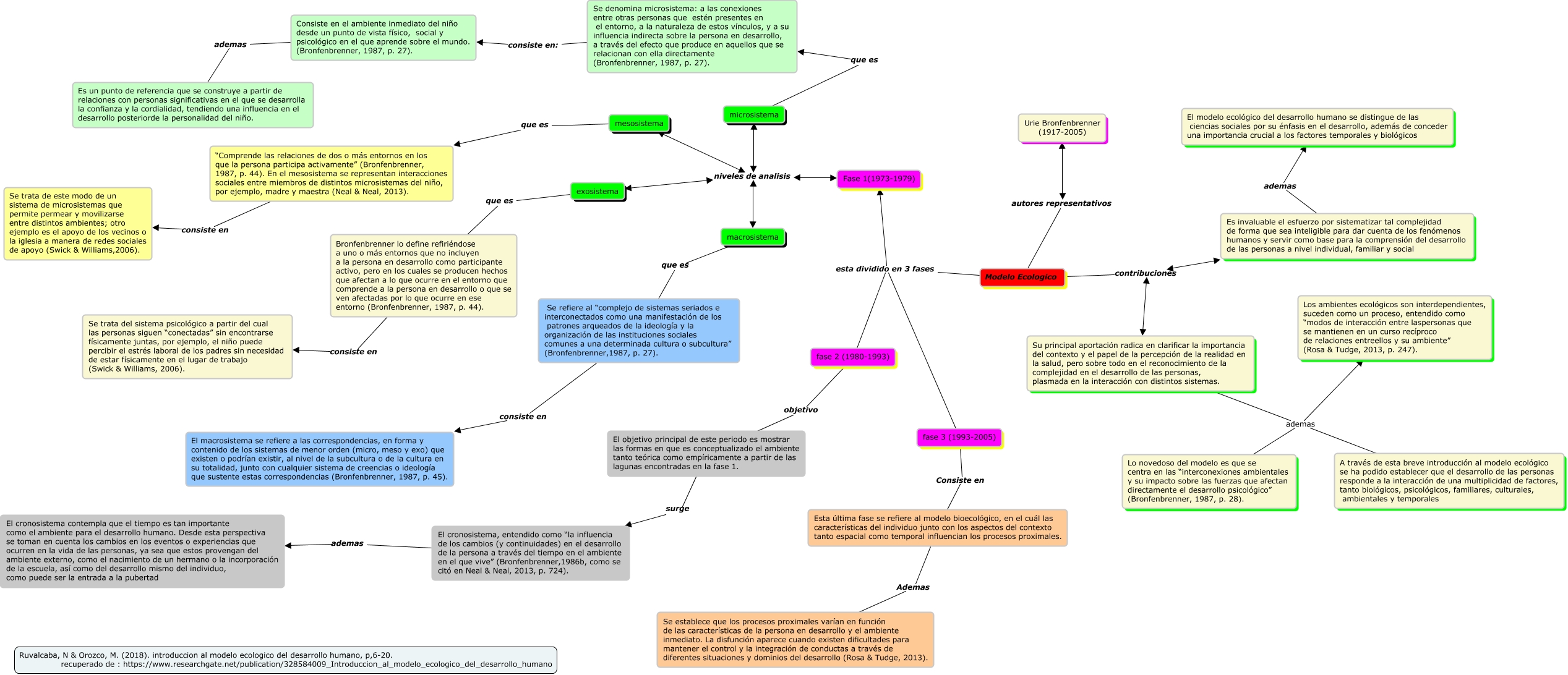 Este Cmap, tiene información relacionada con: modelo ecologico, Su principal aportación radica en clarificar la importancia del contexto y el papel de la percepción de la realidad en la salud, pero sobre todo en el reconocimiento de la complejidad en el desarrollo de las personas, plasmada en la interacción con distintos sistemas. ademas Los ambientes ecológicos son interdependientes, suceden como un proceso, entendido como “modos de interacción entre laspersonas que se mantienen en un curso recíproco de relaciones entreellos y su ambiente” (Rosa & Tudge, 2013, p. 247)., Se refiere al “complejo de sistemas seriados e interconectados como una manifestación de los patrones arqueados de la ideología y la organización de las instituciones sociales comunes a una determinada cultura o subcultura” (Bronfenbrenner,1987, p. 27). consiste en El macrosistema se refiere a las correspondencias, en forma y contenido de los sistemas de menor orden (micro, meso y exo) que existen o podrían existir, al nivel de la subcultura o de la cultura en su totalidad, junto con cualquier sistema de creencias o ideología que sustente estas correspondencias (Bronfenbrenner, 1987, p. 45)., microsistema que es Se denomina microsistema: a las conexiones entre otras personas que estén presentes en el entorno, a la naturaleza de estos vínculos, y a su influencia indirecta sobre la persona en desarrollo, a través del efecto que produce en aquellos que se relacionan con ella directamente (Bronfenbrenner, 1987, p. 27)., Fase 1(1973-1979) niveles de analisis macrosistema, Es invaluable el esfuerzo por sistematizar tal complejidad de forma que sea inteligible para dar cuenta de los fenómenos humanos y servir como base para la comprensión del desarrollo de las personas a nivel individual, familiar y social ademas El modelo ecológico del desarrollo humano se distingue de las ciencias sociales por su énfasis en el desarrollo, además de conceder una importancia crucial a los factores temporales y biológicos, mesosistema que es “Comprende las relaciones de dos o más entornos en los que la persona participa activamente” (Bronfenbrenner, 1987, p. 44). En el mesosistema se representan interacciones sociales entre miembros de distintos microsistemas del niño, por ejemplo, madre y maestra (Neal & Neal, 2013)., Fase 1(1973-1979) niveles de analisis microsistema, Consiste en el ambiente inmediato del niño desde un punto de vista físico, social y psicológico en el que aprende sobre el mundo. (Bronfenbrenner, 1987, p. 27). ademas Es un punto de referencia que se construye a partir de relaciones con personas significativas en el que se desarrolla la confianza y la cordialidad, tendiendo una influencia en el desarrollo posteriorde la personalidad del niño., El objetivo principal de este periodo es mostrar las formas en que es conceptualizado el ambiente tanto teórica como empíricamente a partir de las lagunas encontradas en la fase 1. surge El cronosistema, entendido como “la influencia de los cambios (y continuidades) en el desarrollo de la persona a través del tiempo en el ambiente en el que vive” (Bronfenbrenner,1986b, como se citó en Neal & Neal, 2013, p. 724)., exosistema que es Bronfenbrenner lo define refiriéndose a uno o más entornos que no incluyen a la persona en desarrollo como participante activo, pero en los cuales se producen hechos que afectan a lo que ocurre en el entorno que comprende a la persona en desarrollo o que se ven afectadas por lo que ocurre en ese entorno (Bronfenbrenner, 1987, p. 44)., “Comprende las relaciones de dos o más entornos en los que la persona participa activamente” (Bronfenbrenner, 1987, p. 44). En el mesosistema se representan interacciones sociales entre miembros de distintos microsistemas del niño, por ejemplo, madre y maestra (Neal & Neal, 2013). consiste en Se trata de este modo de un sistema de microsistemas que permite permear y movilizarse entre distintos ambientes; otro ejemplo es el apoyo de los vecinos o la iglesia a manera de redes sociales de apoyo (Swick & Williams,2006)., Bronfenbrenner lo define refiriéndose a uno o más entornos que no incluyen a la persona en desarrollo como participante activo, pero en los cuales se producen hechos que afectan a lo que ocurre en el entorno que comprende a la persona en desarrollo o que se ven afectadas por lo que ocurre en ese entorno (Bronfenbrenner, 1987, p. 44). consiste en Se trata del sistema psicológico a partir del cual las personas siguen “conectadas” sin encontrarse físicamente juntas, por ejemplo, el niño puede percibir el estrés laboral de los padres sin necesidad de estar físicamente en el lugar de trabajo (Swick & Williams, 2006)., Su principal aportación radica en clarificar la importancia del contexto y el papel de la percepción de la realidad en la salud, pero sobre todo en el reconocimiento de la complejidad en el desarrollo de las personas, plasmada en la interacción con distintos sistemas. ademas A través de esta breve introducción al modelo ecológico se ha podido establecer que el desarrollo de las personas responde a la interacción de una multiplicidad de factores, tanto biológicos, psicológicos, familiares, culturales, ambientales y temporales, El cronosistema, entendido como “la influencia de los cambios (y continuidades) en el desarrollo de la persona a través del tiempo en el ambiente en el que vive” (Bronfenbrenner,1986b, como se citó en Neal & Neal, 2013, p. 724). ademas El cronosistema contempla que el tiempo es tan importante como el ambiente para el desarrollo humano. Desde esta perspectiva se toman en cuenta los cambios en los eventos o experiencias que ocurren en la vida de las personas, ya sea que estos provengan del ambiente externo, como el nacimiento de un hermano o la incorporación de la escuela, así como del desarrollo mismo del individuo, como puede ser la entrada a la pubertad, Modelo Ecologico contribuciones Es invaluable el esfu