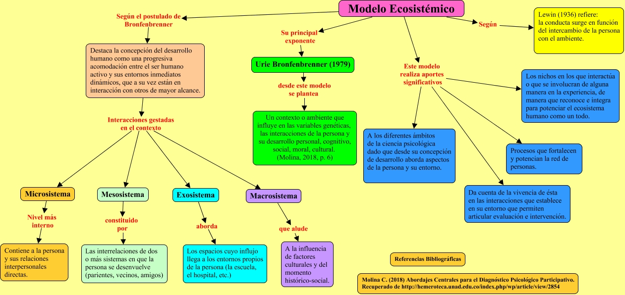 Este Cmap, tiene información relacionada con: Enfoque Ecosistémico, Macrosistema que alude A la influencia de factores culturales y del momento histórico-social., Modelo Ecosistémico Su principal exponente Urie Bronfenbrenner (1979), Modelo Ecosistémico Este modelo realiza aportes significativos Los nichos en los que interactúa o que se involucran de alguna manera en la experiencia, de manera que reconoce e integra para potenciar el ecosistema humano como un todo., Modelo Ecosistémico Este modelo realiza aportes significativos A los diferentes ámbitos de la ciencia psicológica dado que desde su concepción de desarrollo aborda aspectos de la persona y su entorno., Microsistema Nivel más interno Contiene a la persona y sus relaciones interpersonales directas., Destaca la concepción del desarrollo humano como una progresiva acomodación entre el ser humano activo y sus entornos inmediatos dinámicos, que a su vez están en interacción con otros de mayor alcance. Interacciones gestadas en el contexto Microsistema, Modelo Ecosistémico Este modelo realiza aportes significativos Da cuenta de la vivencia de ésta en las interacciones que establece en su entorno que permiten articular evaluación e intervención., Modelo Ecosistémico Este modelo realiza aportes significativos Procesos que fortalecen y potencian la red de personas., Destaca la concepción del desarrollo humano como una progresiva acomodación entre el ser humano activo y sus entornos inmediatos dinámicos, que a su vez están en interacción con otros de mayor alcance. Interacciones gestadas en el contexto Mesosistema, Urie Bronfenbrenner (1979) desde este modelo se plantea Un contexto o ambiente que influye en las variables genéticas, las interacciones de la persona y su desarrollo personal, cognitivo, social, moral, cultural. (Molina, 2018, p. 6), Exosistema aborda Los espacios cuyo influjo llega a los entornos propios de la persona (la escuela, el hospital, etc.), Destaca la concepción del desarrollo humano como una progresiva acomodación entre el ser humano activo y sus entornos inmediatos dinámicos, que a su vez están en interacción con otros de mayor alcance. Interacciones gestadas en el contexto Exosistema, Destaca la concepción del desarrollo humano como una progresiva acomodación entre el ser humano activo y sus entornos inmediatos dinámicos, que a su vez están en interacción con otros de mayor alcance. Interacciones gestadas en el contexto Macrosistema, Mesosistema constituido por Las interrelaciones de dos o más sistemas en que la persona se desenvuelve (parientes, vecinos, amigos), Modelo Ecosistémico Según Lewin (1936) refiere: la conducta surge en función del intercambio de la persona con el ambiente., Modelo Ecosistémico Según el postulado de Bronfenbrenner Destaca la concepción del desarrollo humano como una progresiva acomodación entre el ser humano activo y sus entornos inmediatos dinámicos, que a su vez están en interacción con otros de mayor alcance.