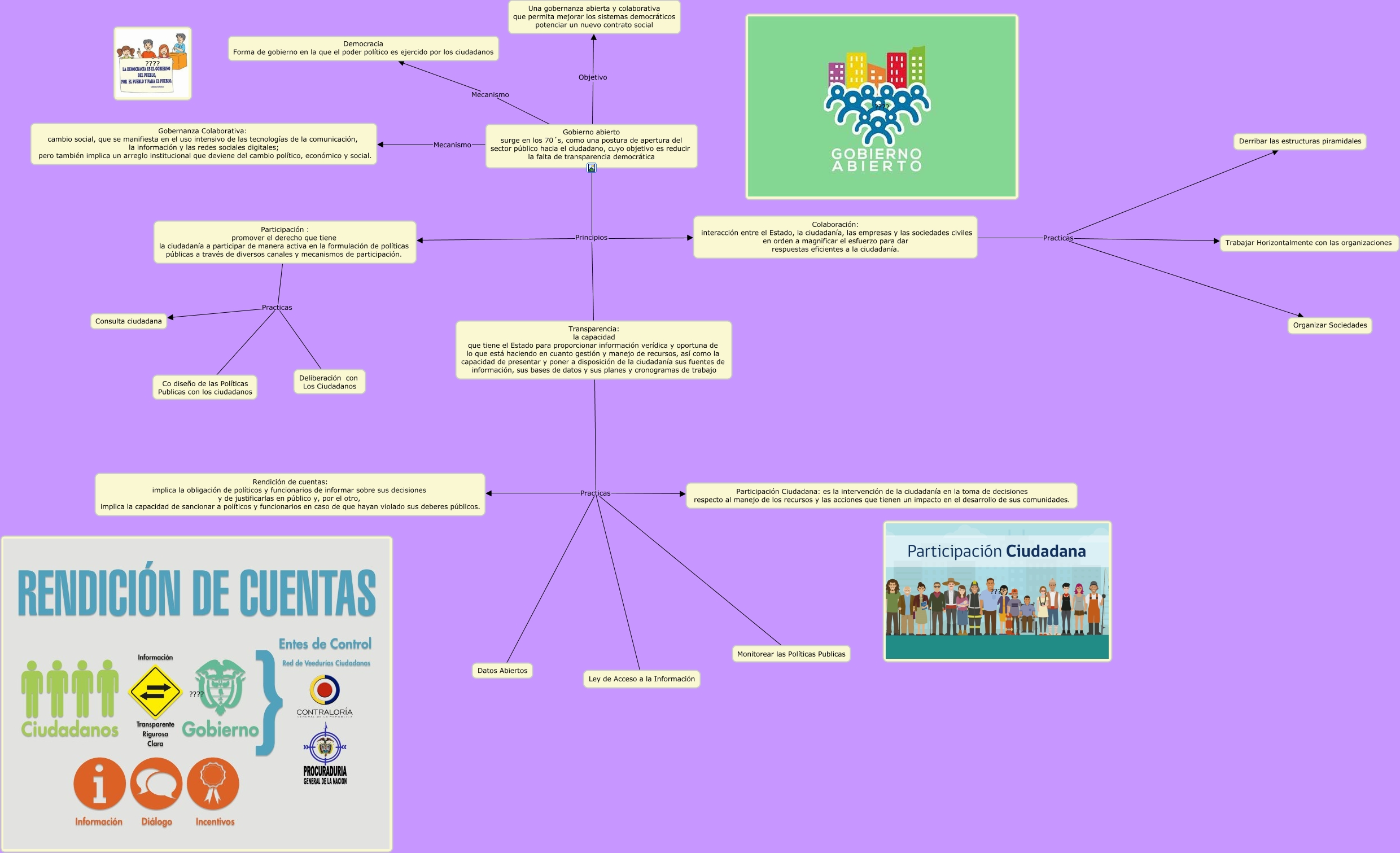 Este Cmap, tiene información relacionada con: MAPA MENTAL GOBIERNO ABIERTO, Colaboración: interacción entre el Estado, la ciudadanía, las empresas y las sociedades civiles en orden a magnificar el esfuerzo para dar respuestas eficientes a la ciudadanía. Practicas Trabajar Horizontalmente con las organizaciones, Transparencia: la capacidad que tiene el Estado para proporcionar información verídica y oportuna de lo que está haciendo en cuanto gestión y manejo de recursos, así como la capacidad de presentar y poner a disposición de la ciudadanía sus fuentes de información, sus bases de datos y sus planes y cronogramas de trabajo Practicas Ley de Acceso a la Información, Transparencia: la capacidad que tiene el Estado para proporcionar información verídica y oportuna de lo que está haciendo en cuanto gestión y manejo de recursos, así como la capacidad de presentar y poner a disposición de la ciudadanía sus fuentes de información, sus bases de datos y sus planes y cronogramas de trabajo Practicas Participación Ciudadana: es la intervención de la ciudadanía en la toma de decisiones respecto al manejo de los recursos y las acciones que tienen un impacto en el desarrollo de sus comunidades., Participación : promover el derecho que tiene la ciudadanía a participar de manera activa en la formulación de políticas públicas a través de diversos canales y mecanismos de participación. Practicas Co diseño de las Políticas Publicas con los ciudadanos, Gobierno abierto surge en los 70´s, como una postura de apertura del sector público hacia el ciudadano, cuyo objetivo es reducir la falta de transparencia democrática Mecanismo Democracia Forma de gobierno en la que el poder político es ejercido por los ciudadanos, Participación : promover el derecho que tiene la ciudadanía a participar de manera activa en la formulación de políticas públicas a través de diversos canales y mecanismos de participación. Practicas Consulta ciudadana, Colaboración: interacción entre el Estado, la ciudadanía, las empresas y las sociedades civiles en orden a magnificar el esfuerzo para dar respuestas eficientes a la ciudadanía. Practicas Organizar Sociedades, Gobierno abierto surge en los 70´s, como una postura de apertura del sector público hacia el ciudadano, cuyo objetivo es reducir la falta de transparencia democrática Objetivo Una gobernanza abierta y colaborativa que permita mejorar los sistemas democráticos potenciar un nuevo contrato social, Gobierno abierto surge en los 70´s, como una postura de apertura del sector público hacia el ciudadano, cuyo objetivo es reducir la falta de transparencia democrática Mecanismo Gobernanza Colaborativa: cambio social, que se manifiesta en el uso intensivo de las tecnologías de la comunicación, la información y las redes sociales digitales; pero también implica un arreglo institucional que deviene del cambio político, económico y social., Gobierno abierto surge en los 70´s, como una postura de apertura del sector público hacia el ciudadano, cuyo objetivo es reducir la falta de transparencia democrática Principios Transparencia: la capacidad que tiene el Estado para proporcionar información verídica y oportuna de lo que está haciendo en cuanto gestión y manejo de recursos, así como la capacidad de presentar y poner a disposición de la ciudadanía sus fuentes de información, sus bases de datos y sus planes y cronogramas de trabajo, Transparencia: la capacidad que tiene el Estado para proporcionar información verídica y oportuna de lo que está haciendo en cuanto gestión y manejo de recursos, así como la capacidad de presentar y poner a disposición de la ciudadanía sus fuentes de información, sus bases de datos y sus planes y cronogramas de trabajo Practicas Datos Abiertos, Transparencia: la capacidad que tiene el Estado para proporcionar información verídica y oportuna de lo que está haciendo en cuanto gestión y manejo de recursos, así como la capacidad de presentar y poner a disposición de la ciudadanía sus fuentes de información, sus bases de datos y sus planes y cronogramas de trabajo Practicas Rendición de cuentas: implica la obligación de políticos y funcionarios de informar sobre sus decisiones y de justificarlas en público y, por el otro, implica la capacidad de sancionar a políticos y funcionarios en caso de que hayan violado sus deberes públicos., Gobierno abierto surge en los 70´s, como una postura de apertura del sector público hacia el ciudadano, cuyo objetivo es reducir la falta de transparencia democrática Principios Colaboración: interacción entre el Estado, la ciudadanía, las empresas y las sociedades civiles en orden a magnificar el esfuerzo para dar respuestas eficientes a la ciudadanía., Gobierno abierto surge en los 70´s, como una postura de apertura del sector público hacia el ciudadano, cuyo objetivo es reducir la falta de transparencia democrática Principios Participación : promover el derecho que tiene la ciudadanía a participar de manera activa en la formulación de políticas públicas a través de diversos canales y mecanismos de participación., Participación : promover el derecho que tiene la ciudadanía a participar de manera activa en la formulación de políticas públicas a través de diversos canales y mecanismos de participación. Practicas Deliberación con Los Ciudadanos, Colaboración: interacción entre el Estado, la ciudadanía, las empresas y las sociedades civiles en orden a magnificar el esfuerzo para dar respuestas eficientes a la ciudadanía. Practicas Derribar las estructuras piramidales, Transparencia: la capacidad que tiene el Estado para proporcionar información verídica y oportuna de lo que está haciendo en cuanto gestión y manejo de recursos, así como la capacidad de presentar y poner a disposición de la ciudadanía sus fuentes de información, sus bases de datos y sus planes y cronogramas de trabajo Practicas Monitorear las Pol
