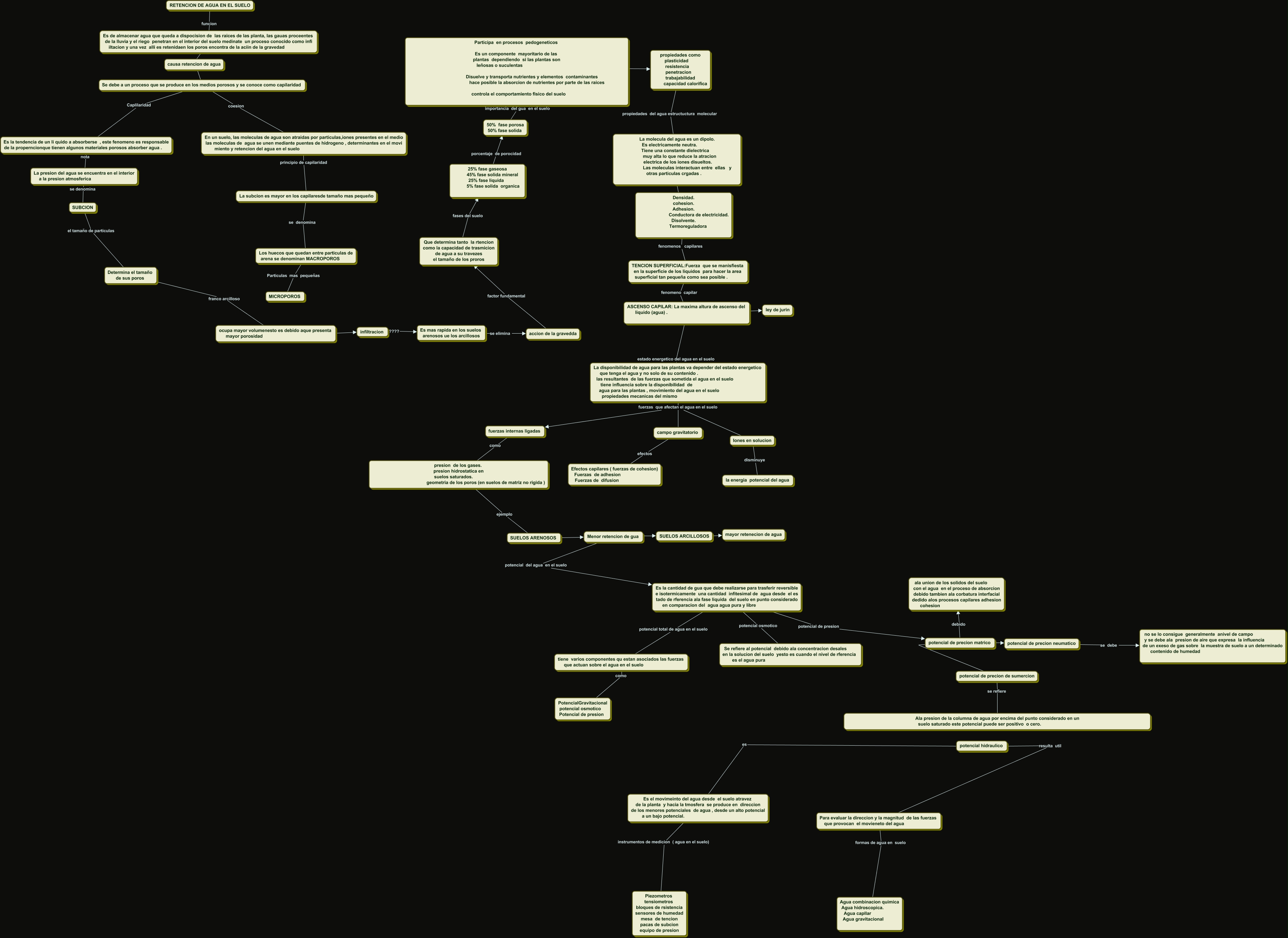 Este Cmap, tiene información relacionada con: mapa 2 oscar leon modificasion2021, Es la cantidad de gua que debe realizarse para trasferir reversible e isotermicamente una cantidad infitesimal de agua desde el es tado de rferencia ala fase liquida del suelo en punto considerado en comparacion del agua agua pura y libre potencial de presion potencial de precion matrico, Menor retencion de gua ???? SUELOS ARCILLOSOS, La subcion es mayor en los capilaresde tamaño mas pequeño se denomina Los huecos que quedan entre particulas de arena se denominan MACROPOROS, potencial de precion de sumercion se refiere Ala presion de la columna de agua por encima del punto considerado en un suelo saturado este potencial puede ser positivo o cero., En un suelo, las moleculas de agua son atraidas por particulas,iones presentes en el medio las moleculas de agua se unen mediante puentes de hidrogeno , determinantes en el movi miento y retencion del agua en el suelo principio de capilaridad La subcion es mayor en los capilaresde tamaño mas pequeño, La disponibilidad de agua para las plantas va depender del estado energetico que tenga el agua y no solo de su contenido . las resultantes de las fuerzas que sometida el agua en el suelo tiene influencia sobre la disponibilidad de agua para las plantas , movimiento del agua en el suelo propiedades mecanicas del mismo fuerzas que afectan el agua en el suelo fuerzas internas ligadas, potencial hidraulico es Es el movimeinto del agua desde el suelo atravez de la planta y hacia la tmosfera se produce en direccion de los menores potenciales de agua , desde un alto potencial a un bajo potencial., Para evaluar la direccion y la magnitud de las fuerzas que provocan el movieneto del agua formas de agua en suelo Agua combinacion quimica Agua hidroscopica. Agua capllar Agua gravitacional, infiltracion ???? Es mas rapida en los suelos arenosos ue los arcillosos, ASCENSO CAPILAR: La maxima altura de ascenso del liquido (agua) . ???? ley de jurin, La disponibilidad de agua para las plantas va depender del estado energetico que tenga el agua y no solo de su contenido . las resultantes de las fuerzas que sometida el agua en el suelo tiene influencia sobre la disponibilidad de agua para las plantas , movimiento del agua en el suelo propiedades mecanicas del mismo fuerzas que afectan el agua en el suelo campo gravitatorio, Participa en procesos pedogeneticos Es un componente mayoritario de las plantas dependiendo si las plantas son leñosas o suculentas Disuelve y transporta nutrientes y elementos contaminantes hace posible la absorcion de nutrientes por parte de las raices controla el comportamiento fisico del suelo ???? propiedades como plasticidad resistencia penetracion trabajabilidad capacidad calorifica, ASCENSO CAPILAR: La maxima altura de ascenso del liquido (agua) . estado energetico del agua en el suelo La disponibilidad de agua para las plantas va depender del estado energetico que tenga el agua y no solo de su contenido . las resultantes de las fuerzas que sometida el agua en el suelo tiene influencia sobre la disponibilidad de agua para las plantas , movimiento del agua en el suelo propiedades mecanicas del mismo, La presion del agua se encuentra en el interior a la presion atmosferica se denomina SUBCION, Es mas rapida en los suelos arenosos ue los arcillosos se elimina accion de la gravedda, Los huecos que quedan entre particulas de arena se denominan MACROPOROS Particulas mas pequeñas MICROPOROS, SUELOS ARENOSOS ???? Menor retencion de gua, Es la cantidad de gua que debe realizarse para trasferir reversible e isotermicamente una cantidad infitesimal de agua desde el es tado de rferencia ala fase liquida del suelo en punto considerado en comparacion del agua agua pura y libre potencial total de agua en el suelo tiene varios componentes qu estan asociados las fuerzas que actuan sobre el agua en el suelo, SUELOS ARCILLOSOS ???? mayor retenecion de agua, Determina el tamaño de sus poros franco arcilloso ocupa mayor volumenesto es debido aque presenta mayor porosidad