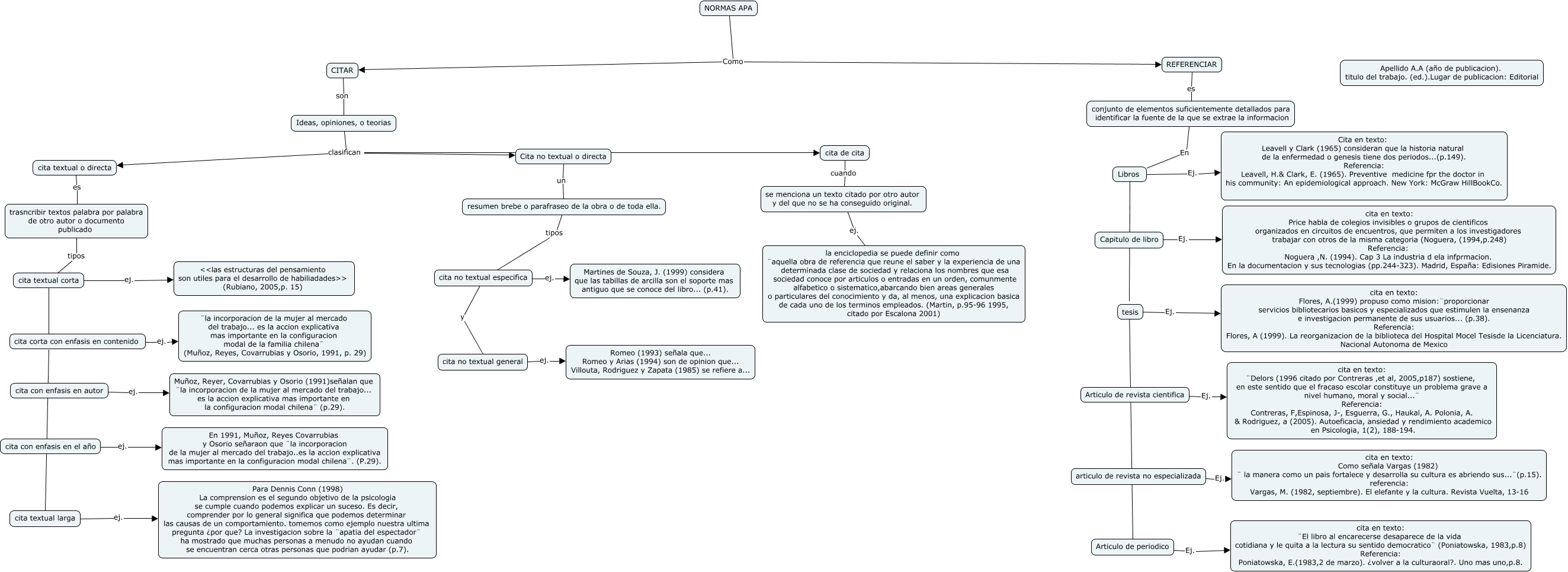 Este Cmap, tiene información relacionada con: normas apa, cita textual larga ej. Para Dennis Conn (1998) La comprension es el segundo objetivo de la psicologia se cumple cuando podemos explicar un suceso. Es decir, comprender por lo general significa que podemos determinar las causas de un comportamiento. tomemos como ejemplo nuestra ultima pregunta ¿por que? La investigacion sobre la ¨apatia del espectador¨ ha mostrado que muchas personas a menudo no ayudan cuando se encuentran cerca otras personas que podrian ayudar (p.7)., REFERENCIAR es conjunto de elementos suficientemente detallados para identificar la fuente de la que se extrae la informacion, cita textual corta ???? cita textual larga, cita textual o directa es trasncribir textos palabra por palabra de otro autor o documento publicado, Ideas, opiniones, o teorias clasifican cita textual o directa, Libros Ej. Cita en texto: Leavell y Clark (1965) consideran que la historia natural de la enfermedad o genesis tiene dos periodos...(p.149). Referencia: Leavell, H.& Clark, E. (1965). Preventive medicine fpr the doctor in his community: An epidemiological approach. New York: McGraw HillBookCo., Cita no textual o directa un resumen brebe o parafraseo de la obra o de toda ella., Libros Articulo de periodico, CITAR son Ideas, opiniones, o teorias, Articulo de revista cientifica Ej. cita en texto: ¨Delors (1996 citado por Contreras ,et al, 2005,p187) sostiene, en este sentido que el fracaso escolar constituye un problema grave a nivel humano, moral y social...¨ Referencia: Contreras, F,Espinosa, J-, Esguerra, G., Haukal, A. Polonia, A. & Rodriguez, a (2005). Autoeficacia, ansiedad y rendimiento academico en Psicologia, 1(2), 188-194., trasncribir textos palabra por palabra de otro autor o documento publicado tipos cita textual corta, cita con enfasis en el año ej. En 1991, Muñoz, Reyes Covarrubias y Osorio señaraon que ¨la incorporacion de la mujer al mercado del trabajo..es la accion explicativa mas importante en la configuracion modal chilena¨. (P.29)., se menciona un texto citado por otro autor y del que no se ha conseguido original. ej. la enciclopedia se puede definir como ¨aquella obra de referencia que reune el saber y la experiencia de una determinada clase de sociedad y relaciona los nombres que esa sociedad conoce por articulos o entradas en un orden, comunmente alfabetico o sistematico,abarcando bien areas generales o particulares del conocimiento y da, al menos, una explicacion basica de cada uno de los terminos empleados. (Martin, p.95-96 1995, citado por Escalona 2001), resumen brebe o parafraseo de la obra o de toda ella. tipos cita no textual especifica, Ideas, opiniones, o teorias clasifican Cita no textual o directa, NORMAS APA Como REFERENCIAR, cita textual corta ej. <<las estructuras del pensamiento son utiles para el desarrollo de habiliadades>> (Rubiano, 2005,p. 15), NORMAS APA Como CITAR, cita corta con enfasis en contenido ej. ¨la incorporacion de la mujer al mercado del trabajo... es la accion explicativa mas importante en la configuracion modal de la familia chilena¨ (Muñoz, Reyes, Covarrubias y Osorio, 1991, p. 29), cita con enfasis en autor ej. Muñoz, Reyer, Covarrubias y Osorio (1991)señalan que ¨la incorporacion de la mujer al mercado del trabajo... es la accion explicativa mas importante en la configuracion modal chilena¨ (p.29).