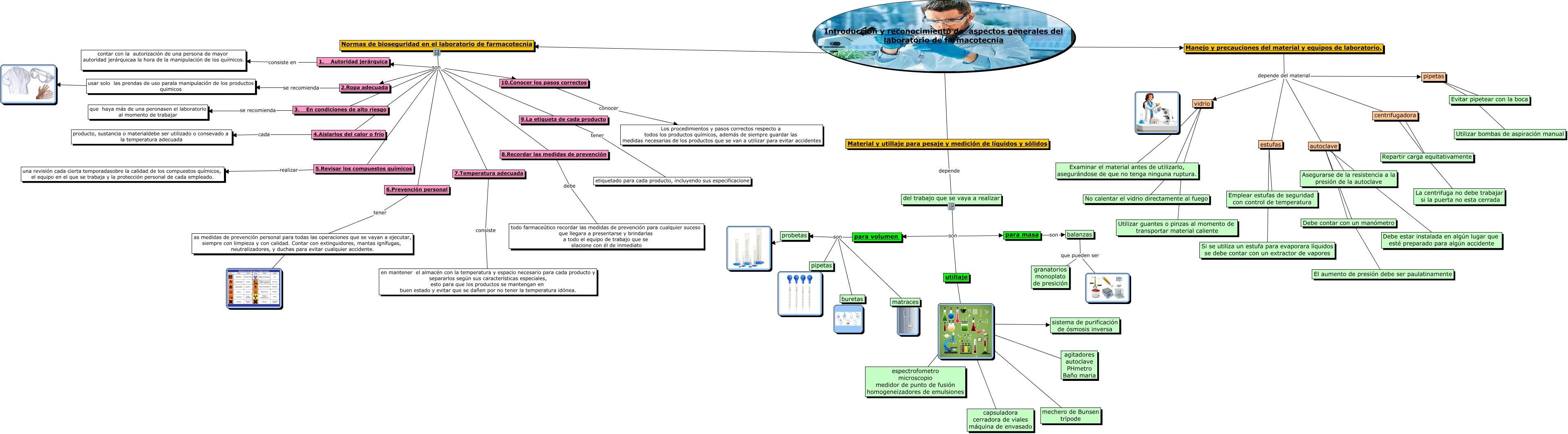 Este Cmap, tiene información relacionada con: farmacotecnia, Normas de bioseguridad en el laboratorio de farmacotecnia son 3. En condiciones de alto riesgo, utillaje sistema de purificación de ósmosis inversa, vidrio ???? No calentar el vidrio directamente al fuego, vidrio Examinar el material antes de utilizarlo, asegurándose de que no tenga ninguna ruptura., Normas de bioseguridad en el laboratorio de farmacotecnia son 4.Aislarlos del calor o frío, estufas ???? Emplear estufas de seguridad con control de temperatura, Normas de bioseguridad en el laboratorio de farmacotecnia son 5.Revisar los compuestos químicos, utillaje capsuladora cerradora de viales máquina de envasado, 10.Conocer los pasos correctos conocer Los procedimientos y pasos correctos respecto a todos los productos químicos, además de siempre guardar las medidas necesarias de los productos que se van a utilizar para evitar accidentes, utillaje mechero de Bunsen trípode, centrifugadora ???? La centrifuga no debe trabajar si la puerta no esta cerrada, para volumen son buretas, del trabajo que se vaya a realizar son para volumen, Introducción y reconocimiento de aspectos generales del laboratorio de farmacotecnia ???? Normas de bioseguridad en el laboratorio de farmacotecnia, para volumen son pipetas, Manejo y precauciones del material y equipos de laboratorio. depende del material centrifugadora, Manejo y precauciones del material y equipos de laboratorio. depende del material vidrio, autoclave ???? Asegurarse de la resistencia a la presión de la autoclave, as medidas de prevención personal para todas las operaciones que se vayan a ejecutar, siempre con limpieza y con calidad. Contar con extinguidores, mantas ignífugas, neutralizadores, y duchas para evitar cualquier accidente. ????, del trabajo que se vaya a realizar son utillaje