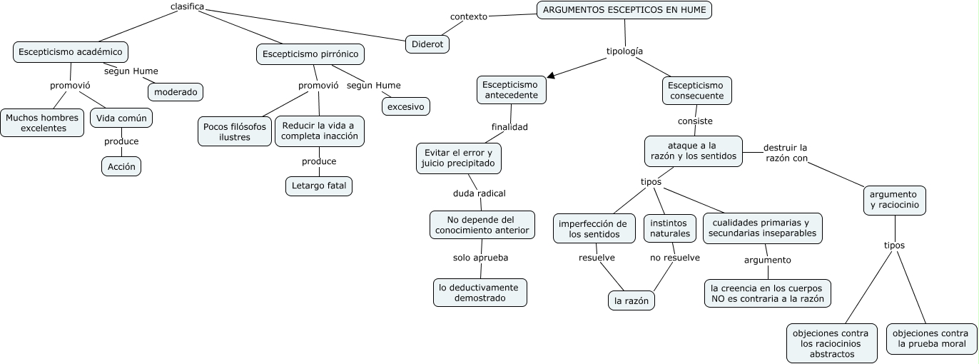 Este Cmap, tiene información relacionada con: HUME, ARGUMENTOS ESCEPTICOS EN HUME contexto Diderot, Escepticismo académico segun Hume moderado, Escepticismo pirrónico segun Hume excesivo, Diderot clasifica Escepticismo pirrónico, argumento y raciocinio tipos objeciones contra los raciocinios abstractos, Escepticismo consecuente consiste ataque a la razón y los sentidos, Escepticismo pirrónico promovió Reducir la vida a completa inacción, Vida común produce Acción, ARGUMENTOS ESCEPTICOS EN HUME tipología Escepticismo consecuente, ataque a la razón y los sentidos tipos cualidades primarias y secundarias inseparables, No depende del conocimiento anterior solo aprueba lo deductivamente demostrado, Escepticismo pirrónico promovió Pocos filósofos ilustres, ataque a la razón y los sentidos tipos imperfección de los sentidos, Diderot clasifica Escepticismo académico, Escepticismo académico promovió Muchos hombres excelentes, imperfección de los sentidos resuelve la razón, ataque a la razón y los sentidos tipos instintos naturales, Escepticismo académico promovió Vida común, instintos naturales no resuelve la razón, ataque a la razón y los sentidos destruir la razón con argumento y raciocinio