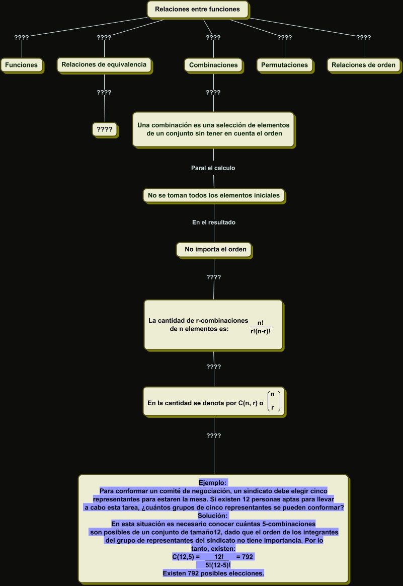 </mtext> <mrow> <mtext> </mtext> </mrow> </mrow> </math>, Relaciones entre funciones ???? Relaciones de orden, Relaciones de equivalencia ???? ????, Relaciones entre funciones ???? Combinaciones, Relaciones entre funciones ???? Relaciones de equivalencia, Relaciones entre funciones ???? Funciones, Relaciones entre funciones ???? Permutaciones, Combinaciones ???? Una combinación es una selección de elementos de un conjunto sin tener en cuenta el orden, Una combinación es una selección de elementos de un conjunto sin tener en cuenta el orden Paral el calculo No se toman todos los elementos iniciales, No se toman todos los elementos iniciales En el resultado <math xmlns="http://www.w3.org/1998/Math/MathML"> <mrow> <mtext> No importa el orden </mtext> </mrow> </math>, <math xmlns="http://www.w3.org/1998/Math/MathML"> <mrow> <mtext> La cantidad de r-combinaciones