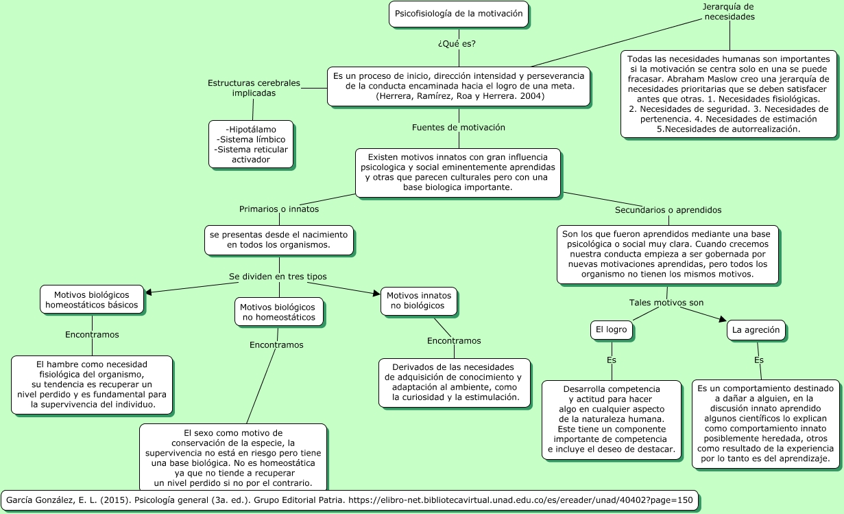 Este Cmap, tiene información relacionada con: Psicofisiología de la motivación, Existen motivos innatos con gran influencia psicologica y social eminentemente aprendidas y otras que parecen culturales pero con una base biologica importante. Primarios o innatos se presentas desde el nacimiento en todos los organismos., Es un proceso de inicio, dirección intensidad y perseverancia de la conducta encaminada hacia el logro de una meta. (Herrera, Ramírez, Roa y Herrera. 2004) Jerarquía de necesidades Todas las necesidades humanas son importantes si la motivación se centra solo en una se puede fracasar. Abraham Maslow creo una jerarquía de necesidades prioritarias que se deben satisfacer antes que otras. 1. Necesidades fisiológicas. 2. Necesidades de seguridad. 3. Necesidades de pertenencia. 4. Necesidades de estimación 5.Necesidades de autorrealización., Existen motivos innatos con gran influencia psicologica y social eminentemente aprendidas y otras que parecen culturales pero con una base biologica importante. Secundarios o aprendidos Son los que fueron aprendidos mediante una base psicológica o social muy clara. Cuando crecemos nuestra conducta empieza a ser gobernada por nuevas motivaciones aprendidas, pero todos los organismo no tienen los mismos motivos., Son los que fueron aprendidos mediante una base psicológica o social muy clara. Cuando crecemos nuestra conducta empieza a ser gobernada por nuevas motivaciones aprendidas, pero todos los organismo no tienen los mismos motivos. Tales motivos son El logro, Es un proceso de inicio, dirección intensidad y perseverancia de la conducta encaminada hacia el logro de una meta. (Herrera, Ramírez, Roa y Herrera. 2004) Fuentes de motivación Existen motivos innatos con gran influencia psicologica y social eminentemente aprendidas y otras que parecen culturales pero con una base biologica importante., Psicofisiología de la motivación ¿Qué es? Es un proceso de inicio, dirección intensidad y perseverancia de la conducta encaminada hacia el logro de una meta. (Herrera, Ramírez, Roa y Herrera. 2004), Es un proceso de inicio, dirección intensidad y perseverancia de la conducta encaminada hacia el logro de una meta. (Herrera, Ramírez, Roa y Herrera. 2004) Estructuras cerebrales implicadas -Hipotálamo -Sistema límbico -Sistema reticular activador, Motivos innatos no biológicos Encontramos Derivados de las necesidades de adquisición de conocimiento y adaptación al ambiente, como la curiosidad y la estimulación., Son los que fueron aprendidos mediante una base psicológica o social muy clara. Cuando crecemos nuestra conducta empieza a ser gobernada por nuevas motivaciones aprendidas, pero todos los organismo no tienen los mismos motivos. Tales motivos son La agreción, se presentas desde el nacimiento en todos los organismos. Se dividen en tres tipos Motivos biológicos no homeostáticos, Motivos biológicos no homeostáticos Encontramos El sexo como motivo de conservación de la especie, la supervivencia no está en riesgo pero tiene una base biológica. No es homeostática ya que no tiende a recuperar un nivel perdido si no por el contrario., El logro Es Desarrolla competencia y actitud para hacer algo en cualquier aspecto de la naturaleza humana. Este tiene un componente importante de competencia e incluye el deseo de destacar., La agreción Es Es un comportamiento destinado a dañar a alguien, en la discusión innato aprendido algunos científicos lo explican como comportamiento innato posiblemente heredada, otros como resultado de la experiencia por lo tanto es del aprendizaje., se presentas desde el nacimiento en todos los organismos. Se dividen en tres tipos Motivos innatos no biológicos, se presentas desde el nacimiento en todos los organismos. Se dividen en tres tipos Motivos biológicos homeostáticos básicos, Motivos biológicos homeostáticos básicos Encontramos El hambre como necesidad fisiológica del organismo, su tendencia es recuperar un nivel perdido y es fundamental para la supervivencia del individuo.