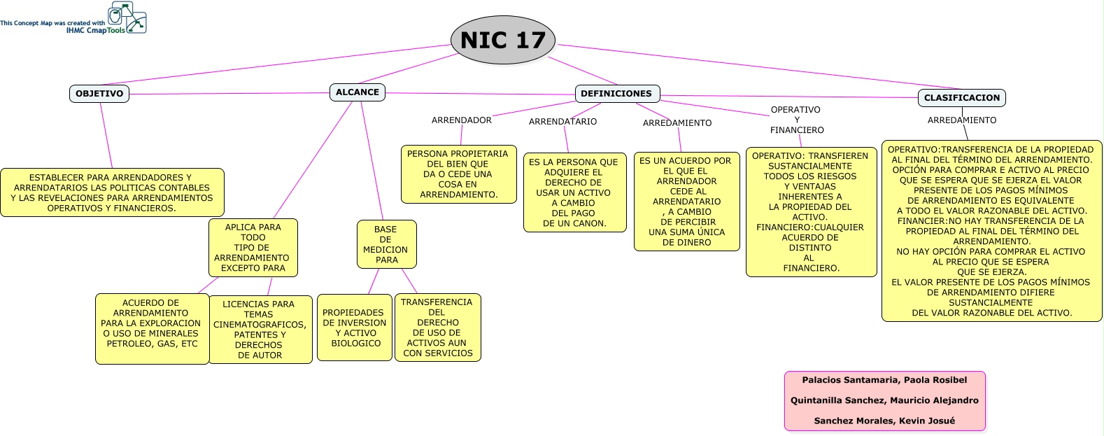 Este Cmap, tiene información relacionada con: nic, NIC 17 ???? CLASIFICACION, NIC 17 ???? ALCANCE, OBJETIVO ???? ESTABLECER PARA ARRENDADORES Y ARRENDATARIOS LAS POLITICAS CONTABLES Y LAS REVELACIONES PARA ARRENDAMIENTOS OPERATIVOS Y FINANCIEROS., DEFINICIONES ARRENDADOR PERSONA PROPIETARIA DEL BIEN QUE DA O CEDE UNA COSA EN ARRENDAMIENTO., ALCANCE ???? APLICA PARA TODO TIPO DE ARRENDAMIENTO EXCEPTO PARA, NIC 17 ???? DEFINICIONES, CLASIFICACION ARREDAMIENTO OPERATIVO:TRANSFERENCIA DE LA PROPIEDAD AL FINAL DEL TÉRMINO DEL ARRENDAMIENTO. OPCIÓN PARA COMPRAR E ACTIVO AL PRECIO QUE SE ESPERA QUE SE EJERZA EL VALOR PRESENTE DE LOS PAGOS MÍNIMOS DE ARRENDAMIENTO ES EQUIVALENTE A TODO EL VALOR RAZONABLE DEL ACTIVO. FINANCIER:NO HAY TRANSFERENCIA DE LA PROPIEDAD AL FINAL DEL TÉRMINO DEL ARRENDAMIENTO. NO HAY OPCIÓN PARA COMPRAR EL ACTIVO AL PRECIO QUE SE ESPERA QUE SE EJERZA. EL VALOR PRESENTE DE LOS PAGOS MÍNIMOS DE ARRENDAMIENTO DIFIERE SUSTANCIALMENTE DEL VALOR RAZONABLE DEL ACTIVO., ALCANCE ???? BASE DE MEDICION PARA, DEFINICIONES OPERATIVO Y FINANCIERO OPERATIVO: TRANSFIEREN SUSTANCIALMENTE TODOS LOS RIESGOS Y VENTAJAS INHERENTES A LA PROPIEDAD DEL ACTIVO. FINANCIERO:CUALQUIER ACUERDO DE DISTINTO AL FINANCIERO., DEFINICIONES ARRENDATARIO ES LA PERSONA QUE ADQUIERE EL DERECHO DE USAR UN ACTIVO A CAMBIO DEL PAGO DE UN CANON., OBJETIVO ???? CLASIFICACION, BASE DE MEDICION PARA ???? PROPIEDADES DE INVERSION Y ACTIVO BIOLOGICO, APLICA PARA TODO TIPO DE ARRENDAMIENTO EXCEPTO PARA ???? LICENCIAS PARA TEMAS CINEMATOGRAFICOS, PATENTES Y DERECHOS DE AUTOR, APLICA PARA TODO TIPO DE ARRENDAMIENTO EXCEPTO PARA ???? ACUERDO DE ARRENDAMIENTO PARA LA EXPLORACION O USO DE MINERALES PETROLEO, GAS, ETC, NIC 17 ???? OBJETIVO, BASE DE MEDICION PARA ???? TRANSFERENCIA DEL DERECHO DE USO DE ACTIVOS AUN CON SERVICIOS, DEFINICIONES ARREDAMIENTO ES UN ACUERDO POR EL QUE EL ARRENDADOR CEDE AL ARRENDATARIO , A CAMBIO DE PERCIBIR UNA SUMA ÚNICA DE DINERO