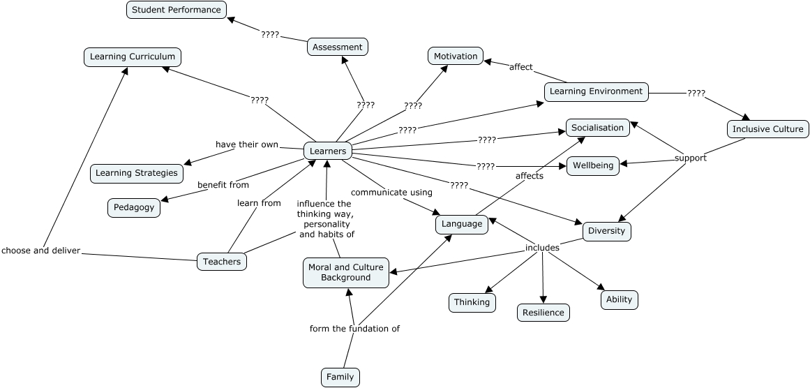 此概念图以 IHMC CmapTools 创建, 内含信息有关于: EPR732, Inclusive Culture support Diversity, Moral and Culture Background influence the thinking way, personality and habits of Learners, Learners ???? Learning Environment, Diversity includes Thinking, Learners ???? Socialisation, Diversity includes Resilience, Diversity includes Ability, Family form the fundation of Language, Learners ???? Learning Curriculum, Learners ???? Wellbeing, Assessment ???? Student Performance, Learners ???? Assessment, Language affects Socialisation, Learners ???? Motivation, Teachers influence the thinking way, personality and habits of Learners, Learners communicate using Language, Diversity includes Language, Learners ???? Diversity, Teachers learn from Learners, Family form the fundation of Moral and Culture Background