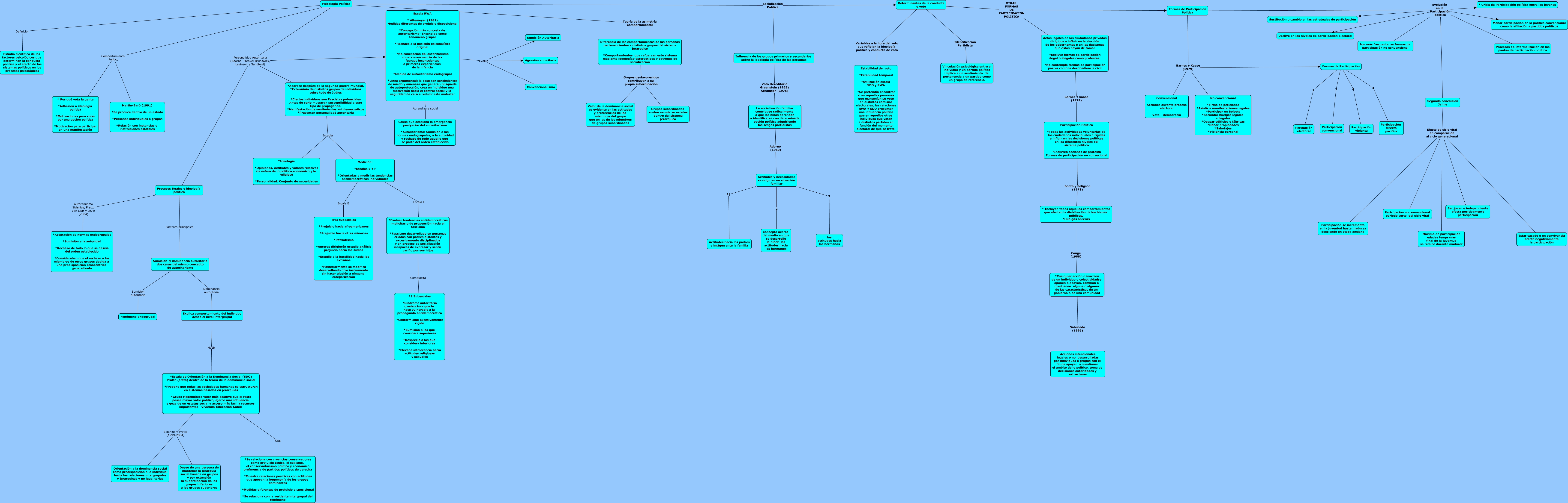Este Cmap, tiene información relacionada con: PSICOLOGÍA POLÍTICA, Escala RWA * Altemeyer (1981) Medidas diferentes de prejuicio disposicional *Concepción más concreta de autoritarismo- Entendido como fenómeno grupal *Rechazo a la posición psiconalítica original *No concepción del autoritarismo como consecuencia de las fuerzas inconscientes o primeras experiencias de la infancia *Medida de autoritarismo endogrupal *Línea argumental: la base son sentimientos de miedo y amenaza que generan búsqueda de autoprotección, crea en individuo una motivación hacia el control social y la seguridad de cara a reducir este malestar Evalúa Sumisión Autoritaria, Formas de Participación Política Barnes y Kaase (1979) Formas de Participación, Formas de Participación Política Barnes y Kaase (1979) Convencional Acciones durante proceso electoral Voto - Democracia, Segunda conclusión Jaime Efecto de ciclo vital en comparación al ciclo generacional Paricipación no convencional periodo corto del ciclo vital, *Aparece despúes de la segunda guerra mundial. *Exterminio de distintos grupos de individuos sobre todo de Judíos *Ciertos individuos son Fascistas potenciales Antes de serlo muestran susceptibilidad a este tipo de propaganda. *Manifestación de sentimientos antidemocráticos *Presentan personalidad autoritaria Estudia Medición: *Escalas E Y F *Orientadas a medir las tendencias antidemocráticas individuales, Segunda conclusión Jaime Efecto de ciclo vital en comparación al ciclo generacional Ser joven e independiente afecta positivamente participación, Formas de Participación 2 Participación convencional, Actos legales de los ciudadanos privados dirigidos a influir en la elección de los gobernantes o en las decisones que estos hayan de tomar *Excluye formas de participación ilegal o alegales como protestas. *No contempla formas de participación pasiva como la desobediencia civil Barnes Y kaase (1979) Participación Política *Todas las actividades voluntarias de los ciudadanos individuales dirigidas a influir en las decisiones políticas en los diferentes niveles del sistema político *Incluyen acciones de protesta Formas de participación no convecional, Procesos Duales e ideología política Factores principales Sumisión y dominancia autoritaria dos caras del mismo concepto de autoritarismo, Segunda conclusión Jaime Efecto de ciclo vital en comparación al ciclo generacional Estar casado o en convivencia afecta negativamente la participación, Determinantes de la conducta o voto Identificación Partidista Vinculación psicológica entre el individuo y un partido político implica a un sentimiento de pertenencia a un partido como un grupo de referencia., *Cualquier acción o inacción de un individuo o colectividadse oponen o apoyan, cambian o mantienen alguna o algunas de las características de un gobierno o de una comunidad Sabucedo (1996) Acciones intencionales legales o no, desarrolladas por individuos o grupos con el fin de apoyar o cuestionar el ambito de lo político, toma de decisiones autoridades y estructuras, Escala RWA * Altemeyer (1981) Medidas diferentes de prejuicio disposicional *Concepción más concreta de autoritarismo- Entendido como fenómeno grupal *Rechazo a la posición psiconalítica original *No concepción del autoritarismo como consecuencia de las fuerzas inconscientes o primeras experiencias de la infancia *Medida de autoritarismo endogrupal *Línea argumental: la base son sentimientos de miedo y amenaza que generan búsqueda de autoprotección, crea en individuo una motivación hacia el control social y la seguridad de cara a reducir este malestar Evalúa Agresión autoritaria, Actitudes y necesidades se originan en situación familiar 1| Actitudes hacia los padres e imágen ante la familia, Determinantes de la conducta o voto Variables a la hora del voto que reflejan la ideología política y conducta de voto Estabilidad del voto *Estabilidad temporal *Utilización escala SDO y RWA *Se pretendía encontrar si en aquellas personas que mantenían su voto en distintos comisios electorales, las relaciones RWA Y SDO presentan una influencia política que en aquellos otros individuos que votan a distintos partidos en función del momento electoral de que se trate., Procesos Duales e ideología política Autoritarismo Sidanius, Pratto Van Laar y Levin (2004) *Aceptación de normas endogrupales *Sumisión a la autoridad *Rechazo de todo lo que se desvía del orden establecido *Consideraban que el rechazo a los miembros de otros grupos debida a una predisposición etnocéntrica generalizada, Formas de Participación Política Evolución en la Participación política * Crisis de Participación política entre los jovenes, Sumisión y dominancia autoritaria dos caras del mismo concepto de autoritarismo Sumisión autoritaria Fenómeno endogrupal, Explica comportamiento del individuo desde el nivel intergrupal Medir *Escala de Orientación a la Dominancia Social (SDO) Pratto (1994) dentro de la teoría de la dominancia social *Propone que todas las sociedades humanas se estructuran en sistemas basados en jerarquías *Grupo Hegemónico valor más positivo que el resto posee mayor valor político, ejerce más influencia y goza de un estatus social y acceso más facil a recursos importantes - Vivienda-Educación-Salud, Segunda conclusión Jaime Efecto de ciclo vital en comparación al ciclo generacional Participación se incrementa en la juventud hasta madurez desciende en etapa anciana