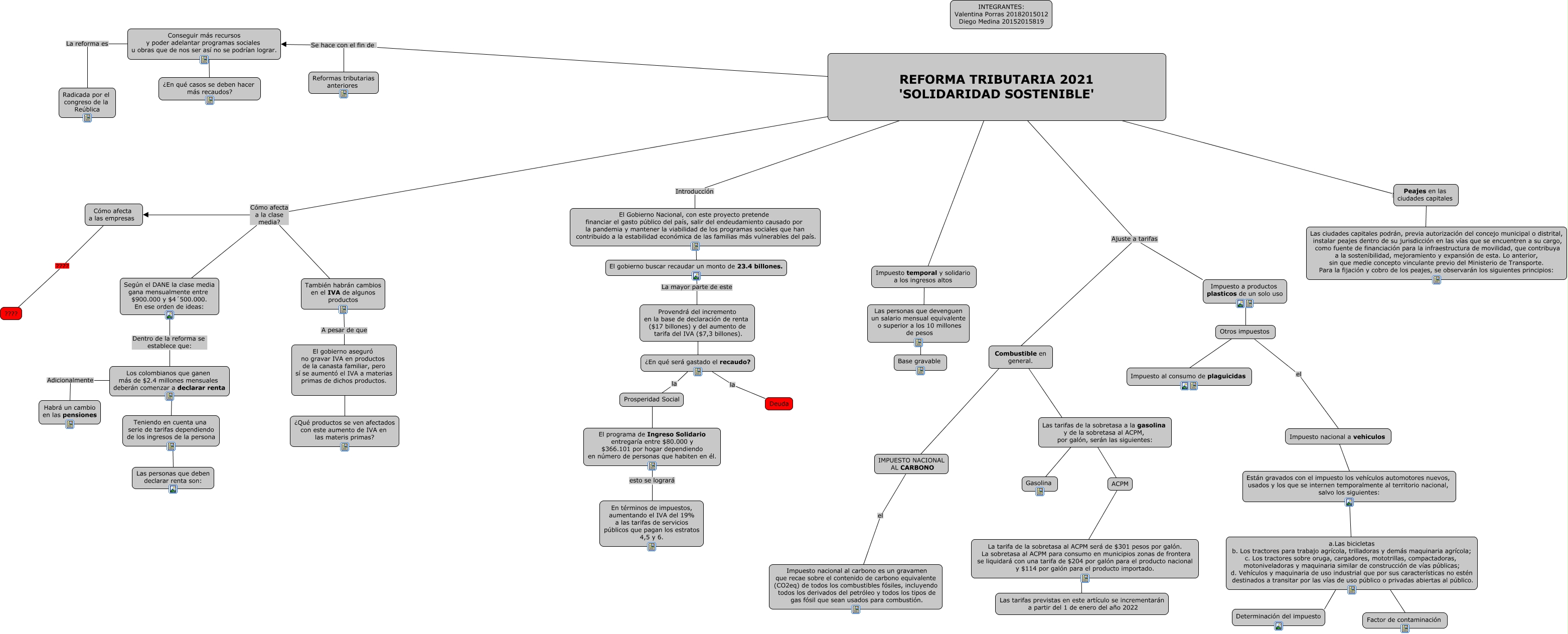 Este Cmap, tiene información relacionada con: REFORMA DUQUE, REFORMA TRIBUTARIA 2021 'SOLIDARIDAD SOSTENIBLE' Ajuste a tarifas Impuesto a productos plasticos de un solo uso, Impuesto nacional a vehiculos ???? Están gravados con el impuesto los vehículos automotores nuevos, usados y los que se internen temporalmente al territorio nacional, salvo los siguientes:, Las personas que devenguen un salario mensual equivalente o superior a los 10 millones de pesos ???? Base gravable, REFORMA TRIBUTARIA 2021 'SOLIDARIDAD SOSTENIBLE' Cómo afecta a la clase media? Según el DANE la clase media gana mensualmente entre $900.000 y $4´500.000. En ese orden de ideas:, REFORMA TRIBUTARIA 2021 'SOLIDARIDAD SOSTENIBLE' Se hace con el fin de Reformas tributarias anteriores, Impuesto a productos plasticos de un solo uso ???? Otros impuestos, Prosperidad Social ???? El programa de Ingreso Solidario entregaría entre $80.000 y $366.101 por hogar dependiendo en número de personas que habiten en él., Teniendo en cuenta una serie de tarifas dependiendo de los ingresos de la persona ???? Las personas que deben declarar renta son:, a.Las bicicletas b. Los tractores para trabajo agrícola, trilladoras y demás maquinaria agrícola; c. Los tractores sobre oruga, cargadores, mototrillas, compactadoras, motoniveladoras y maquinaria similar de construcción de vías públicas; d. Vehículos y maquinaria de uso industrial que por sus características no estén destinados a transitar por las vías de uso público o privadas abiertas al público. ???? Factor de contaminación, REFORMA TRIBUTARIA 2021 'SOLIDARIDAD SOSTENIBLE' Introducción El Gobierno Nacional, con este proyecto pretende financiar el gasto público del país, salir del endeudamiento causado por la pandemia y mantener la viabilidad de los programas sociales que han contribuido a la estabilidad económica de las familias más vulnerables del país., REFORMA TRIBUTARIA 2021 'SOLIDARIDAD SOSTENIBLE' Cómo afecta a la clase media? También habrán cambios en el IVA de algunos productos, Otros impuestos ???? Impuesto al consumo de plaguicidas, Las tarifas de la sobretasa a la gasolina y de la sobretasa al ACPM, por galón, serán las siguientes: ???? ACPM, IMPUESTO NACIONAL AL CARBONO el Impuesto nacional al carbono es un gravamen que recae sobre el contenido de carbono equivalente (CO2eq) de todos los combustibles fósiles, incluyendo todos los derivados del petróleo y todos los tipos de gas fósil que sean usados para combustión., a.Las bicicletas b. Los tractores para trabajo agrícola, trilladoras y demás maquinaria agrícola; c. Los tractores sobre oruga, cargadores, mototrillas, compactadoras, motoniveladoras y maquinaria similar de construcción de vías públicas; d. Vehículos y maquinaria de uso industrial que por sus características no estén destinados a transitar por las vías de uso público o privadas abiertas al público. ???? Determinación del impuesto, Los colombianos que ganen más de $2.4 millones mensuales deberán comenzar a declarar renta Adicionalmente Habrá un cambio en las pensiones, ACPM ???? La tarifa de la sobretasa al ACPM será de $301 pesos por galón. La sobretasa al ACPM para consumo en municipios zonas de frontera se liquidará con una tarifa de $204 por galón para el producto nacional y $114 por galón para el producto importado., REFORMA TRIBUTARIA 2021 'SOLIDARIDAD SOSTENIBLE' Ajuste a tarifas Combustible en general., Los colombianos que ganen más de $2.4 millones mensuales deberán comenzar a declarar renta ???? Teniendo en cuenta una serie de tarifas dependiendo de los ingresos de la persona, También habrán cambios en el IVA de algunos productos A pesar de que El gobierno aseguró no gravar IVA en productos de la canasta familiar, pero sí se aumentó el IVA a materias primas de dichos productos.
