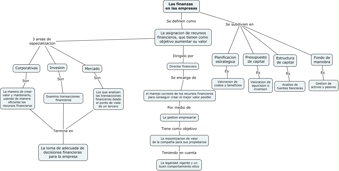Este Cmap, tiene información relacionada con: Guia 1 cap 1, Corporativas Son La manera de crear valor y mantenerlo, usando de manera eficiente los recursos financieros, Invesion Son Examina transacciones financieras, La maximizacion de valor de la compañia para sus propietarios Teniendo en cuenta La legalidad vigente y un buen comportamiento etico, Las finanzas en las empresas Se definen como La asignacion de recursos financieros, que tienen como objetivo aumentar su valor, La manera de crear valor y mantenerlo, usando de manera eficiente los recursos financieros Termina en La toma de adecuada de decisiones financieras para la empresa, La asignacion de recursos financieros, que tienen como objetivo aumentar su valor 3 areas de especializacion Mercado, Los que analizan las transacciones financieras desde el punto de vista de un tercero Termina en La toma de adecuada de decisiones financieras para la empresa, Los que analizan las transacciones financieras desde el punto de vista de un tercero Termina en La toma de adecuada de decisiones financieras para la empresa, Las finanzas en las empresas Se subdivien en Fondo de maniobra, La asignacion de recursos financieros, que tienen como objetivo aumentar su valor Dirigido por Director financiero, La gestion empresarial Tiene como objetivo La maximizacion de valor de la compañia para sus propietarios, Planificacion estrategica Es Valoracion de costes y beneficios, La asignacion de recursos financieros, que tienen como objetivo aumentar su valor 3 areas de especializacion Corporativas, Examina transacciones financieras Termina en La toma de adecuada de decisiones financieras para la empresa, Las finanzas en las empresas Se subdivien en Planificacion estrategica, Las finanzas en las empresas Se subdivien en Estructura de capital, La manera de crear valor y mantenerlo, usando de manera eficiente los recursos financieros Termina en La toma de adecuada de decisiones financieras para la empresa, Las finanzas en las empresas Se subdivien en Presupuesto de capital, Director financiero Se encarga de el manejo correcto de los recursos financieros para conseguir crear el mejor valor posible, Mercado Son Los que analizan las transacciones financieras desde el punto de vista de un tercero