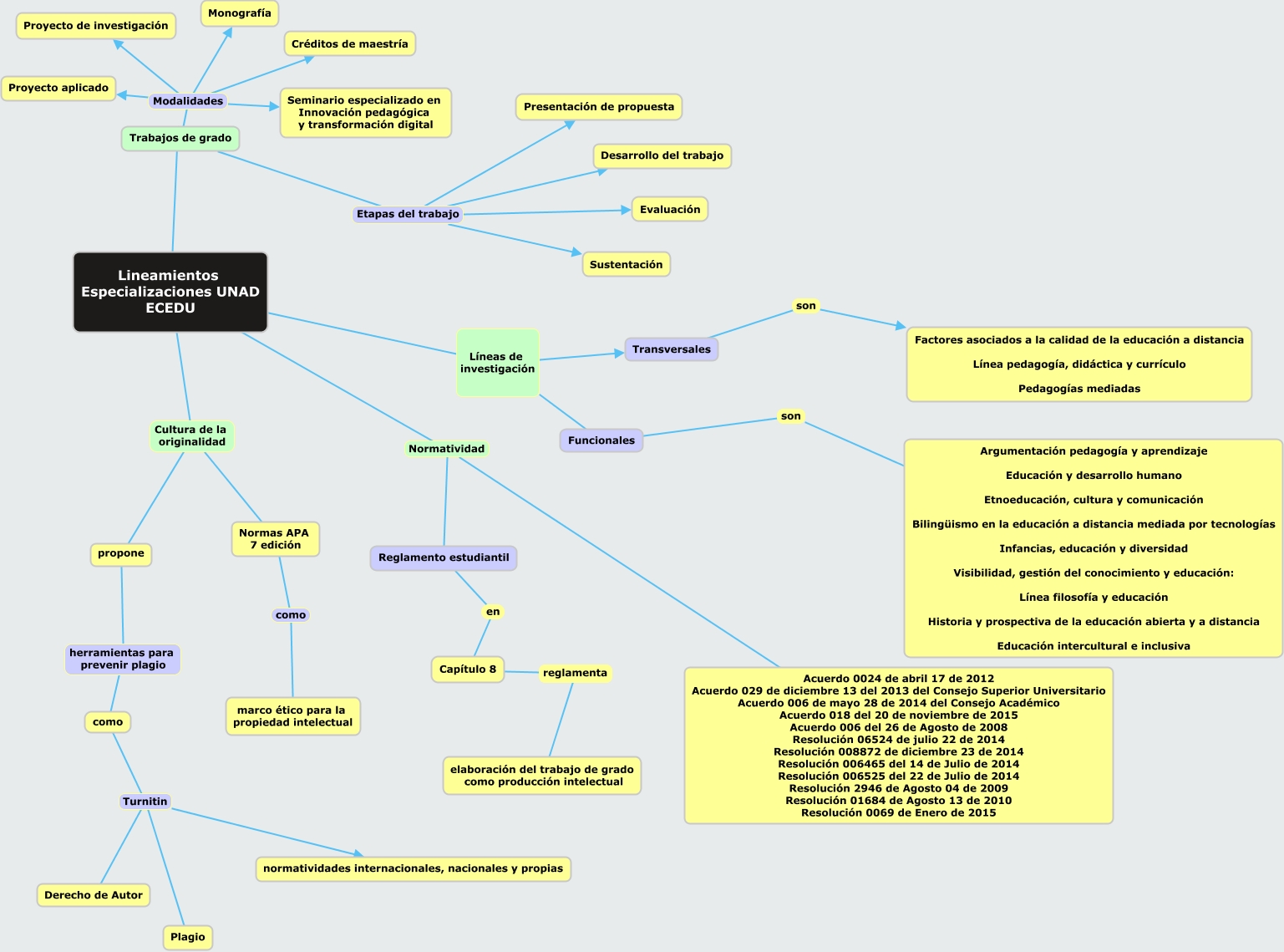 Este Cmap, tiene información relacionada con: Lineamientos UNAD ECEDU, Capítulo 8 reglamenta elaboración del trabajo de grado como producción intelectual, Reglamento estudiantil en Capítulo 8, Trabajos de grado Modalidades Proyecto aplicado, Trabajos de grado Modalidades Créditos de maestría, Normas APA 7 edición como marco ético para la propiedad intelectual, Lineamientos Especializaciones UNAD ECEDU Trabajos de grado, Lineamientos Especializaciones UNAD ECEDU Líneas de investigación Transversales, Funcionales son Argumentación pedagogía y aprendizaje Educación y desarrollo humano Etnoeducación, cultura y comunicación Bilingüismo en la educación a distancia mediada por tecnologías Infancias, educación y diversidad Visibilidad, gestión del conocimiento y educación: Línea filosofía y educación Historia y prospectiva de la educación abierta y a distancia Educación intercultural e inclusiva, Lineamientos Especializaciones UNAD ECEDU Cultura de la originalidad Normas APA 7 edición, Lineamientos Especializaciones UNAD ECEDU Líneas de investigación Funcionales, como Turnitin normatividades internacionales, nacionales y propias, propone herramientas para prevenir plagio como, Lineamientos Especializaciones UNAD ECEDU Normatividad Acuerdo 0024 de abril 17 de 2012 Acuerdo 029 de diciembre 13 del 2013 del Consejo Superior Universitario Acuerdo 006 de mayo 28 de 2014 del Consejo Académico Acuerdo 018 del 20 de noviembre de 2015 Acuerdo 006 del 26 de Agosto de 2008 Resolución 06524 de julio 22 de 2014 Resolución 008872 de diciembre 23 de 2014 Resolución 006465 del 14 de Julio de 2014 Resolución 006525 del 22 de Julio de 2014 Resolución 2946 de Agosto 04 de 2009 Resolución 01684 de Agosto 13 de 2010 Resolución 0069 de Enero de 2015, Transversales son Factores asociados a la calidad de la educación a distancia Línea pedagogía, didáctica y currículo Pedagogías mediadas, Lineamientos Especializaciones UNAD ECEDU Normatividad Reglamento estudiantil, Trabajos de grado Modalidades Proyecto de investigación, como Turnitin Plagio, Trabajos de grado Etapas del trabajo Evaluación, Trabajos de grado Etapas del trabajo Desarrollo del trabajo, Trabajos de grado Modalidades Seminario especializado en Innovación pedagógica y transformación digital