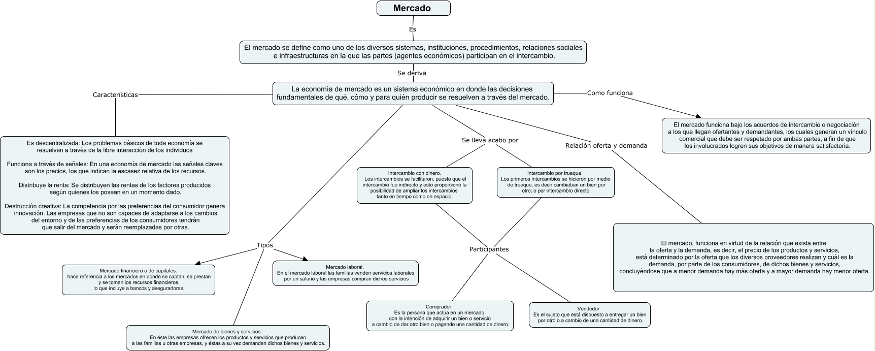 Este Cmap, tiene información relacionada con: Mercado, La economía de mercado es un sistema económico en donde las decisiones fundamentales de qué, cómo y para quién producir se resuelven a través del mercado. Relación oferta y demanda El mercado, funciona en virtud de la relación que exista entre la oferta y la demanda, es decir, el precio de los productos y servicios, está determinado por la oferta que los diversos proveedores realizan y cuál es la demanda, por parte de los consumidores, de dichos bienes y servicios, concluyéndose que a menor demanda hay más oferta y a mayor demanda hay menor oferta., La economía de mercado es un sistema económico en donde las decisiones fundamentales de qué, cómo y para quién producir se resuelven a través del mercado. Tipos Mercado laboral. En el mercado laboral las familias venden servicios laborales por un salario y las empresas compran dichos servicios, Mercado Es El mercado se define como uno de los diversos sistemas, instituciones, procedimientos, relaciones sociales e infraestructuras en la que las partes (agentes económicos) participan en el intercambio., La economía de mercado es un sistema económico en donde las decisiones fundamentales de qué, cómo y para quién producir se resuelven a través del mercado. Se lleva acabo por Intercambio por trueque. Los primeros intercambios se hicieron por medio de trueque, es decir cambiaban un bien por otro; o por intercambio directo., Intercambio con dinero. Los intercambios se facilitaron, puesto que el intercambio fue indirecto y esto proporcionó la posibilidad de ampliar los intercambios tanto en tiempo como en espacio. Participantes Vendedor. Es el sujeto que está dispuesto a entregar un bien por otro o a cambio de una cantidad de dinero., La economía de mercado es un sistema económico en donde las decisiones fundamentales de qué, cómo y para quién producir se resuelven a través del mercado. Características Es descentralizada: Los problemas básicos de toda economía se resuelven a través de la libre interacción de los individuos Funciona a través de señales: En una economía de mercado las señales claves son los precios, los que indican la escasez relativa de los recursos. Distribuye la renta: Se distribuyen las rentas de los factores producidos según quienes los posean en un momento dado. Destrucción creativa: La competencia por las preferencias del consumidor genera innovación. Las empresas que no son capaces de adaptarse a los cambios del entorno y de las preferencias de los consumidores tendrán que salir del mercado y serán reemplazadas por otras., Intercambio por trueque. Los primeros intercambios se hicieron por medio de trueque, es decir cambiaban un bien por otro; o por intercambio directo. Participantes Vendedor. Es el sujeto que está dispuesto a entregar un bien por otro o a cambio de una cantidad de dinero., La economía de mercado es un sistema económico en donde las decisiones fundamentales de qué, cómo y para quién producir se resuelven a través del mercado. Se lleva acabo por Intercambio con dinero. Los intercambios se facilitaron, puesto que el intercambio fue indirecto y esto proporcionó la posibilidad de ampliar los intercambios tanto en tiempo como en espacio., La economía de mercado es un sistema económico en donde las decisiones fundamentales de qué, cómo y para quién producir se resuelven a través del mercado. Tipos Mercado de bienes y servicios. En éste las empresas ofrecen los productos y servicios que producen a las familias u otras empresas, y éstas a su vez demandan dichos bienes y servicios., Intercambio por trueque. Los primeros intercambios se hicieron por medio de trueque, es decir cambiaban un bien por otro; o por intercambio directo. Participantes Comprador. Es la persona que actúa en un mercado con la intención de adquirir un bien o servicio a cambio de dar otro bien o pagando una cantidad de dinero., Intercambio con dinero. Los intercambios se facilitaron, puesto que el intercambio fue indirecto y esto proporcionó la posibilidad de ampliar los intercambios tanto en tiempo como en espacio. Participantes Comprador. Es la persona que actúa en un mercado con la intención de adquirir un bien o servicio a cambio de dar otro bien o pagando una cantidad de dinero., La economía de mercado es un sistema económico en donde las decisiones fundamentales de qué, cómo y para quién producir se resuelven a través del mercado. Como funciona El mercado funciona bajo los acuerdos de intercambio o negociación a los que llegan ofertantes y demandantes, los cuales generan un vínculo comercial que debe ser respetado por ambas partes, a fin de que los involucrados logren sus objetivos de manera satisfactoria., La economía de mercado es un sistema económico en donde las decisiones fundamentales de qué, cómo y para quién producir se resuelven a través del mercado. Tipos Mercado financiero o de capitales. hace referencia a los mercados en donde se captan, se prestan y se toman los recursos financieros, lo que incluye a bancos y aseguradoras., El mercado se define como uno de los diversos sistemas, instituciones, procedimientos, relaciones sociales e infraestructuras en la que las partes (agentes económicos) participan en el intercambio. Se deriva La economía de mercado es un sistema económico en donde las decisiones fundamentales de qué, cómo y para quién producir se resuelven a través del mercado.