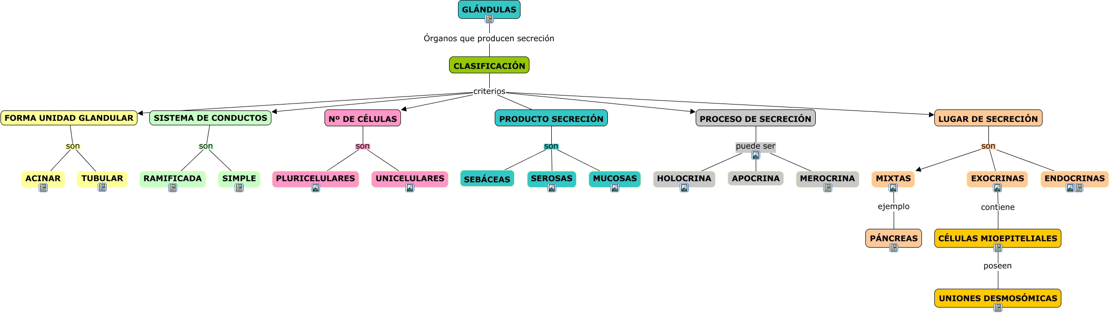 Este Cmap, tiene información relacionada con: ESQUEMA GLÁNDULAS, Nº DE CÉLULAS son PLURICELULARES, PROCESO DE SECRECIÓN puede ser HOLOCRINA, LUGAR DE SECRECIÓN son MIXTAS, MIXTAS ejemplo PÁNCREAS, EXOCRINAS contiene CÉLULAS MIOEPITELIALES, CLASIFICACIÓN criterios SISTEMA DE CONDUCTOS, CLASIFICACIÓN criterios LUGAR DE SECRECIÓN, CLASIFICACIÓN criterios PRODUCTO SECRECIÓN, SISTEMA DE CONDUCTOS son SIMPLE, CÉLULAS MIOEPITELIALES poseen UNIONES DESMOSÓMICAS, CLASIFICACIÓN criterios PROCESO DE SECRECIÓN, PRODUCTO SECRECIÓN son SEBÁCEAS, FORMA UNIDAD GLANDULAR son ACINAR, CLASIFICACIÓN criterios Nº DE CÉLULAS, CLASIFICACIÓN criterios FORMA UNIDAD GLANDULAR, Nº DE CÉLULAS son UNICELULARES, PROCESO DE SECRECIÓN puede ser MEROCRINA, PROCESO DE SECRECIÓN puede ser APOCRINA, SISTEMA DE CONDUCTOS son RAMIFICADA, LUGAR DE SECRECIÓN son ENDOCRINAS