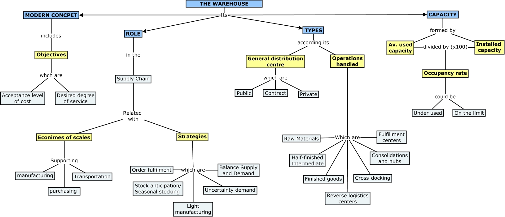 Este Cmap, tiene información relacionada con: Map Chap 1, Operations handled Which are Fulfillment centers, Operations handled Which are Consolidations and hubs, Econimes of scales Supporting manufacturing, Strategies which are Light manufacturing, General distribution centre which are Contract, Objectives whch are Acceptance level of cost, General distribution centre which are Contract, Occupancy rate could be On the limit, Operations handled Which are Raw Materials, purchasing Supporting Transportation, Objectives whch are Desired degree of service, Operations handled Which are Half-finished Intermediate, Operations handled Which are Cross-docking, Strategies which are Order fulfilment, THE WAREHOUSE Its ROLE, TYPES according its General distribution centre, purchasing Supporting manufacturing, THE WAREHOUSE Its MODERN CONCPET, CAPACITY formed by Av. used capacity, TYPES according its Operations handled