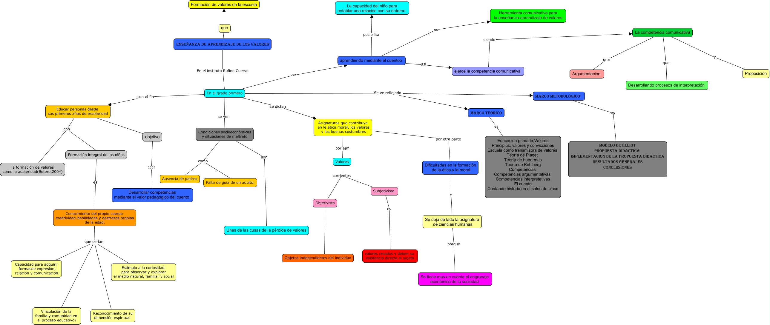 Este Cmap, tiene información relacionada con: Formacion de valores, Condiciones socioeconómicas y situaciones de maltrato como Falta de guía de un adulto., En el grado primero se dictan Asignaturas que contribuye en le ética moral, los valores y las buenas costumbres, Educar personas desde sus primeros años de escolaridad ???? objetivo, En el grado primero Se ve reflejado marco metodológico, objetivo ???? Desarrollar competencias mediante el valor pedagógico del cuento, La competencia comunicativa que Desarrollando procesos de interpretación, En el grado primero se ven Condiciones socioeconómicas y situaciones de maltrato, Subjetivista es valores creados y deben su existencia directa al sujeto, aprendiendo mediante el cuentoo SE ejerce la competencia comunicativa, Dificultades en la formación de la ética y la moral y Se deja de lado la asignatura de ciencias humanas, Conocimiento del propio cuerpo creatividad-habilidades y destrezas propias de la edad. que serian Reconocimiento de su dimensión espiritual, Educar personas desde sus primeros años de escolaridad con Formación integral de los niños, Condiciones socioeconómicas y situaciones de maltrato como Ausencia de padres, Marco teórico es Educación primaria,Valores Principios, valores y convicciones Escuela como transmisora de valores Teoría de Piaget Teoría de habermas Teoría de Kohlberg Competencias Competencias argumentativas Competencias interpretativas El cuento Contando historia en el salón de clase, La competencia comunicativa una Argumentación, En el grado primero Se ve reflejado Marco teórico, Conocimiento del propio cuerpo creatividad-habilidades y destrezas propias de la edad. que serian Capacidad para adquirir formasde expresión, relación y comunicación., La competencia comunicativa y Proposición, Condiciones socioeconómicas y situaciones de maltrato son Unas de las cusas de la pérdida de valores, Conocimiento del propio cuerpo creatividad-habilidades y destrezas propias de la edad. que serian Vinculación de la familia y comunidad en el proceso educativo?