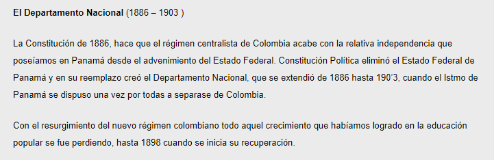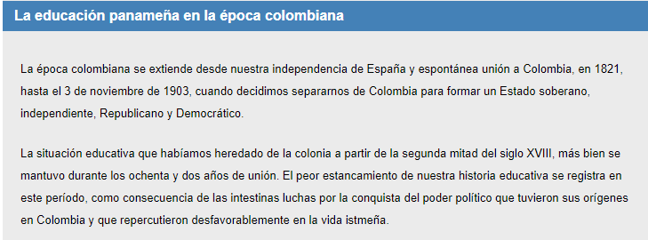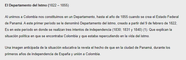 Este Cmap, tiene información relacionada con: Antecedentes de la Educación en Panamá, Periódo de Unión a Colombia (1821-1903) Se crea la Escuelas para la formación de maestros, Periódo de Unión a Colombia (1821-1903) El Estado Deferal de Panamá es transformado a El Departamento Nacional (1885-1903), El Departamento del Istmo (1821-1855) Se ve favorecida La Educación de la Mujer, Antecedentes De La Educación en Panamá (1519-1903) Se segmentan en Periódos históricos de la educación en Panamá, Periódo de Unión a Colombia (1821-1903) Se sentaron las bases de una reforma en la enseñanza en El Estado Federal de Panamá (1855-1885), Periódo de Unión a Colombia (1821-1903) Se establece El Departamento del Istmo (1821-1855), Periódos históricos de la educación en Panamá como El Periódo de Unión a Colombia (1821-1903), Periódo Colonial Español (1519-1821) Se funda La Universidad Javeriana (1749-1767), Periódos históricos de la educación en Panamá como El Periódo Colonial Español (1519-1821)