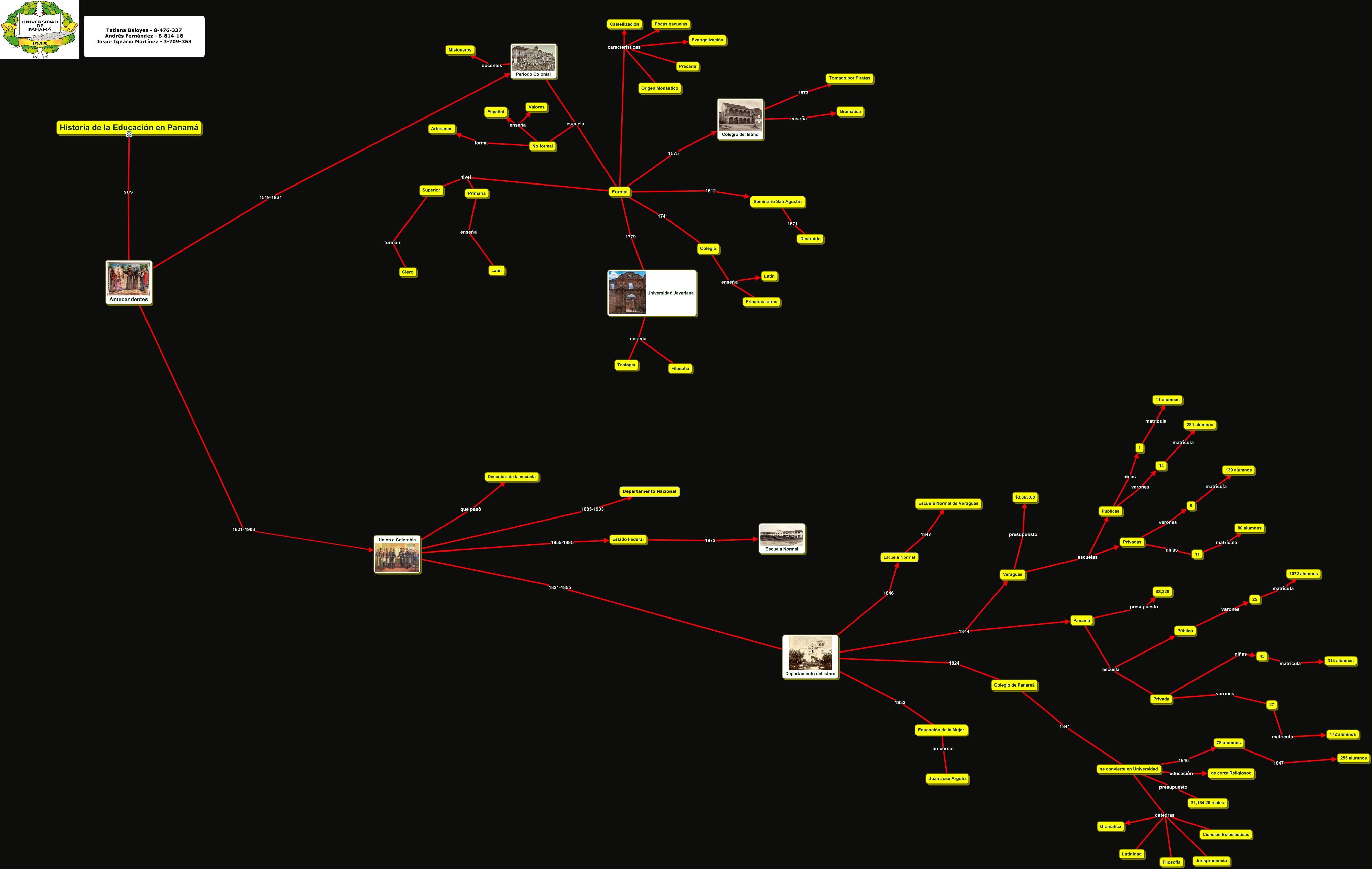 Este Cmap, tiene información relacionada con: Mapa Conceptual - Baloyes_Fernández_Martínez, 11 matrícula 80 alumnas, se convierte en Universidad cátedras Filosofía, 25 matrícula 1072 alumnos, Formal nivel Primaria, Universidad Javeriana enseña Filosofía, Período Colonial docentes Misioneros, Departamento del Istmo 1832 Educación de la Mujer, Privada varones 27, Veraguas escuelas Privadas, No formal enseña Valores, Privadas varones 8, Privada niñas 45, Formal características Origen Monástico, Formal 1741 Colegio, se convierte en Universidad educación de corte Religiosoo, Antecendentes 1519-1821 Período Colonial, Colegio enseña Latín, 27 matrícula 172 alumnos, Formal 1612 Seminario San Agustín, Departamento del Istmo 1844 Panamá