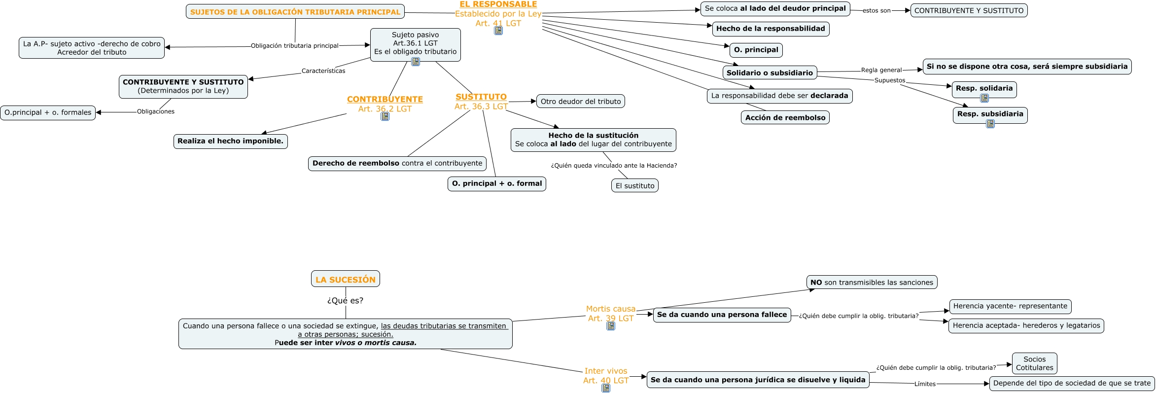 Este Cmap, tiene información relacionada con: mapa 10 cambiado, Sujeto pasivo Art.36.1 LGT Es el obligado tributario SUSTITUTO Art. 36.3 LGT Hecho de la sustitución Se coloca al lado del lugar del contribuyente, Sujeto pasivo Art.36.1 LGT Es el obligado tributario SUSTITUTO Art. 36.3 LGT O. principal + o. formal, Sujeto pasivo Art.36.1 LGT Es el obligado tributario Características CONTRIBUYENTE Y SUSTITUTO (Determinados por la Ley), Solidario o subsidiario Supuestos Resp. subsidiaria, SUJETOS DE LA OBLIGACIÓN TRIBUTARIA PRINCIPAL Obligación tributaria principal Sujeto pasivo Art.36.1 LGT Es el obligado tributario, Se da cuando una persona jurídica se disuelve y liquida Límites Depende del tipo de sociedad de que se trate, Cuando una persona fallece o una sociedad se extingue, las deudas tributarias se transmiten a otras personas; sucesión. Puede ser inter vivos o mortis causa. Mortis causa Art. 39 LGT NO son transmisibles las sanciones, SUJETOS DE LA OBLIGACIÓN TRIBUTARIA PRINCIPAL EL RESPONSABLE Establecido por la Ley Art. 41 LGT Acción de reembolso, Cuando una persona fallece o una sociedad se extingue, las deudas tributarias se transmiten a otras personas; sucesión. Puede ser inter vivos o mortis causa. Inter vivos Art. 40 LGT Se da cuando una persona jurídica se disuelve y liquida, Solidario o subsidiario Regla general Si no se dispone otra cosa, será siempre subsidiaria, SUJETOS DE LA OBLIGACIÓN TRIBUTARIA PRINCIPAL EL RESPONSABLE Establecido por la Ley Art. 41 LGT La responsabilidad debe ser declarada, Cuando una persona fallece o una sociedad se extingue, las deudas tributarias se transmiten a otras personas; sucesión. Puede ser inter vivos o mortis causa. Mortis causa Art. 39 LGT Se da cuando una persona fallece, Se da cuando una persona fallece ¿Quién debe cumplir la oblig. tributaria? Herencia aceptada- herederos y legatarios, Se da cuando una persona fallece ¿Quién debe cumplir la oblig. tributaria? Herencia yacente- representante, Sujeto pasivo Art.36.1 LGT Es el obligado tributario SUSTITUTO Art. 36.3 LGT Derecho de reembolso contra el contribuyente, SUJETOS DE LA OBLIGACIÓN TRIBUTARIA PRINCIPAL EL RESPONSABLE Establecido por la Ley Art. 41 LGT Hecho de la responsabilidad, Se da cuando una persona jurídica se disuelve y liquida ¿Quién debe cumplir la oblig. tributaria? Socios Cotitulares, SUJETOS DE LA OBLIGACIÓN TRIBUTARIA PRINCIPAL Obligación tributaria principal La A.P- sujeto activo -derecho de cobro Acreedor del tributo, SUJETOS DE LA OBLIGACIÓN TRIBUTARIA PRINCIPAL EL RESPONSABLE Establecido por la Ley Art. 41 LGT O. principal, CONTRIBUYENTE Y SUSTITUTO (Determinados por la Ley) Obligaciones O.principal + o. formales