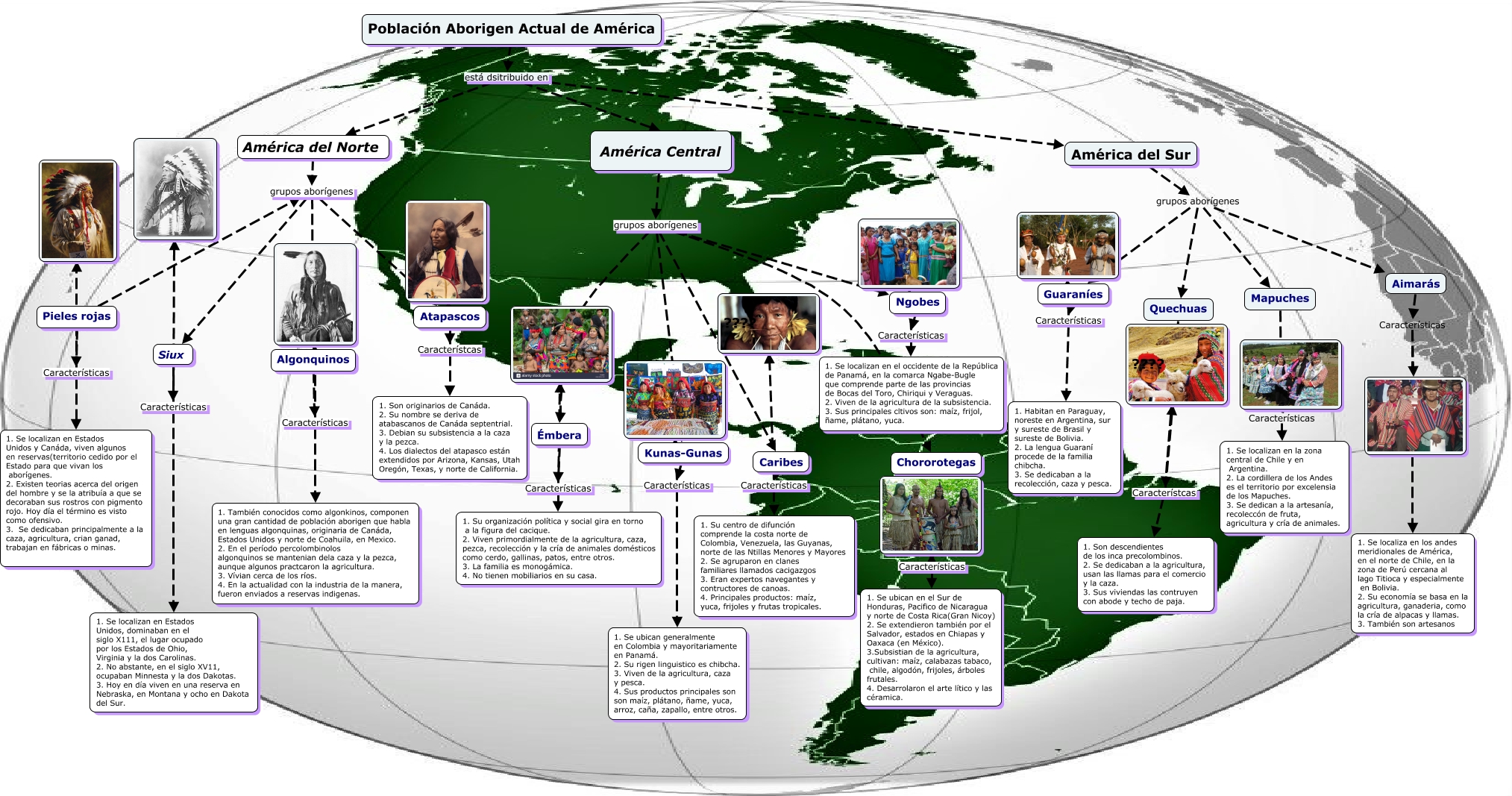 Este Cmap, tiene información relacionada con: MAPA CONCEPTUAL SOBRE LA POBLACIÓN ABORIGEN ACTUAL DE AMÉRICA, Población Aborigen Actual de América está dsitribuido en América Central, Pieles rojas Características 1. Se localizan en Estados Unidos y Canáda, viven algunos en reservas(territorio cedido por el Estado para que vivan los aborígenes. 2. Existen teorias acerca del origen del hombre y se la atribuía a que se decoraban sus rostros con pigmento rojo. Hoy día el término es visto como ofensivo. 3. Se dedicaban principalmente a la caza, agricultura, crian ganad, trabajan en fábricas o minas., América Central grupos aborígenes Caribes, Guaraníes Características, Kunas-Gunas Características, Caribes Características ????, América del Sur grupos aborígenes Mapuches, América Central grupos aborígenes Ngobes, Aimarás Características, Chororotegas Características, Pieles rojas Características, Émbera Características 1. Su organización política y social gira en torno a la figura del cacique. 2. Viven primordialmente de la agricultura, caza, pezca, recolección y la cría de animales domésticos como cerdo, gallinas, patos, entre otros. 3. La familia es monogámica. 4. No tienen mobiliarios en su casa., América del Norte grupos aborígenes Algonquinos, Kunas-Gunas Características 1. Se ubican generalmente en Colombia y mayoritariamente en Panamá. 2. Su rigen linguistico es chibcha. 3. Viven de la agricultura, caza y pesca. 4. Sus productos principales son son maíz, plátano, ñame, yuca, arroz, caña, zapallo, entre otros., Mapuches Características 1. Se localizan en la zona central de Chile y en Argentina. 2. La cordillera de los Andes es el territorio por excelensia de los Mapuches. 3. Se dedican a la artesanía, recoleccón de fruta, agricultura y cría de animales., Población Aborigen Actual de América está dsitribuido en América del Sur, América Central grupos aborígenes Émbera, Siux Características 1. Se localizan en Estados Unidos, dominaban en el siglo X111, el lugar ocupado por los Estados de Ohio, Virginia y la dos Carolinas. 2. No abstante, en el siglo XV11, ocupaban Minnesta y la dos Dakotas. 3. Hoy en día viven en una reserva en Nebraska, en Montana y ocho en Dakota del Sur., Atapascos Característcas, Quechuas Característcas ????
