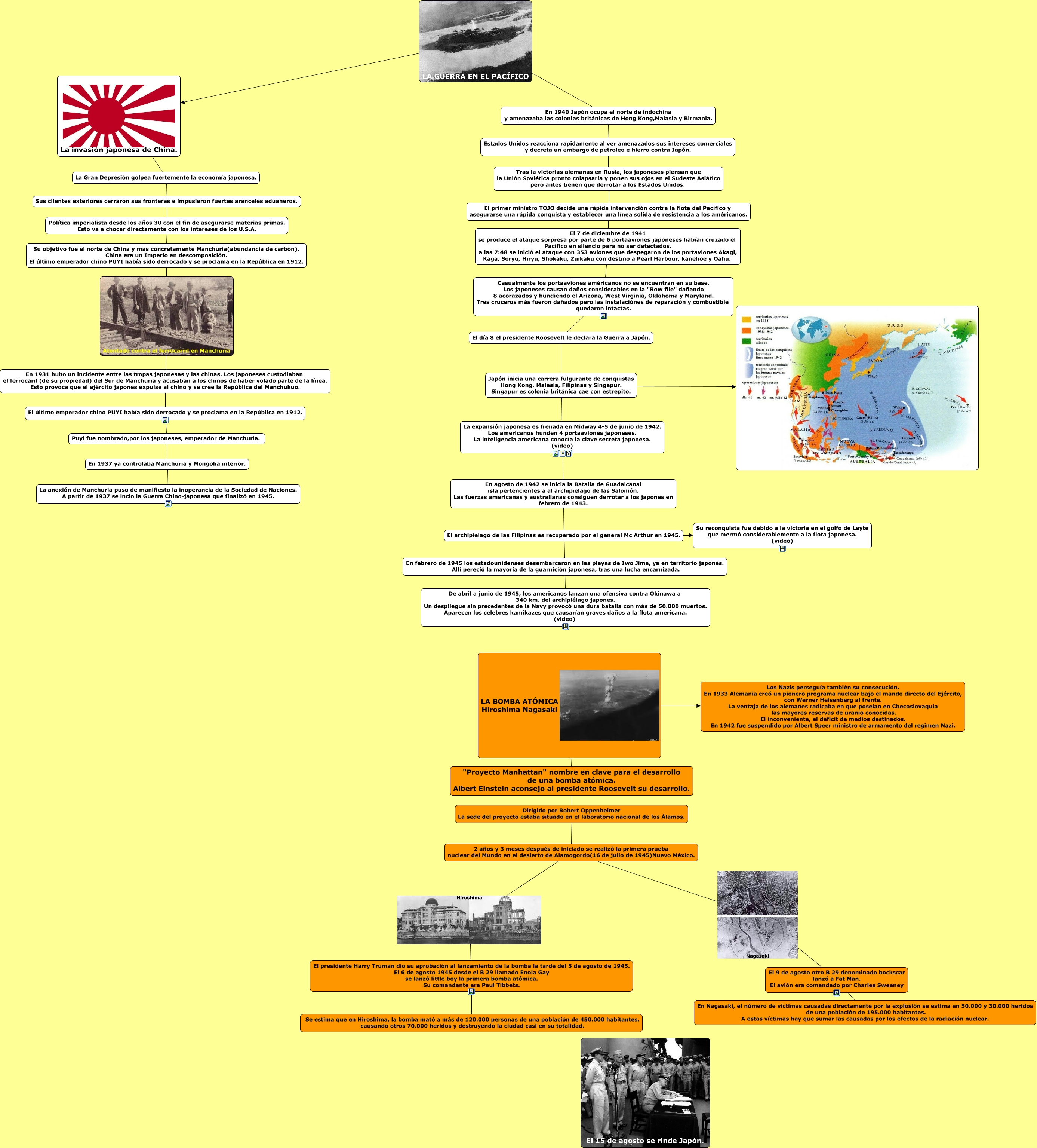 Este Cmap, tiene información relacionada con: La guerra en Asia y el Pacífico, Japón inicia una carrera fulgurante de conquistas Hong Kong, Malasia, Filipinas y Singapur. Singapur es colonia británica cae con estrepito., LA BOMBA ATÓMICA Hiroshima Nagasaki Los Nazis perseguía también su consecución. En 1933 Alemania creó un pionero programa nuclear bajo el mando directo del Ejército, con Werner Heisenberg al frente. La ventaja de los alemanes radicaba en que poseían en Checoslovaquia las mayores reservas de uranio conocidas. El inconveniente, el déficit de medios destinados. En 1942 fue suspendido por Albert Speer ministro de armamento del regimen Nazi., En 1937 ya controlaba Manchuria y Mongolia interior. La anexión de Manchuria puso de manifiesto la inoperancia de la Sociedad de Naciones. A partir de 1937 se incio la Guerra Chino-japonesa que finalizó en 1945., La invasión japonesa de China. ???? La Gran Depresión golpea fuertemente la economía japonesa., Estados Unidos reacciona rapidamente al ver amenazados sus intereses comerciales y decreta un embargo de petroleo e hierro contra Japón. Tras la victorias alemanas en Rusia, los japoneses piensan que la Unión Soviética pronto colapsaría y ponen sus ojos en el Sudeste Asiático pero antes tienen que derrotar a los Estados Unidos., Casualmente los portaaviones américanos no se encuentran en su base. Los japoneses causan daños considerables en la "Row file" dañando 8 acorazados y hundiendo el Arizona, West Virginia, Oklahoma y Maryland. Tres cruceros más fueron dañados pero las instalaciónes de reparación y combustible quedaron intactas. El día 8 el presidente Roosevelt le declara la Guerra a Japón., El presidente Harry Truman dio su aprobación al lanzamiento de la bomba la tarde del 5 de agosto de 1945. El 6 de agosto 1945 desde el B 29 llamado Enola Gay se lanzó little boy la primera bomba atómica. Su comandante era Paul Tibbets. Se estima que en Hiroshima, la bomba mató a más de 120.000 personas de una población de 450.000 habitantes, causando otros 70.000 heridos y destruyendo la ciudad casi en su totalidad., 2 años y 3 meses después de iniciado se realizó la primera prueba nuclear del Mundo en el desierto de Alamogordo(16 de julio de 1945)Nuevo México. Hiroshima El presidente Harry Truman dio su aprobación al lanzamiento de la bomba la tarde del 5 de agosto de 1945. El 6 de agosto 1945 desde el B 29 llamado Enola Gay se lanzó little boy la primera bomba atómica. Su comandante era Paul Tibbets., En 1940 Japón ocupa el norte de indochina y amenazaba las colonias británicas de Hong Kong,Malasia y Birmania. Estados Unidos reacciona rapidamente al ver amenazados sus intereses comerciales y decreta un embargo de petroleo e hierro contra Japón., En 1931 hubo un incidente entre las tropas japonesas y las chinas. Los japoneses custodiaban el ferrocaril (de su propiedad) del Sur de Manchuria y acusaban a los chinos de haber volado parte de la línea. Esto provoca que el ejército japones expulse al chino y se cree la República del Manchukuo. El último emperador chino PUYI había sido derrocado y se proclama en la República en 1912., Su objetivo fue el norte de China y más concretamente Manchuria(abundancia de carbón). China era un Imperio en descomposición. El último emperador chino PUYI había sido derrocado y se proclama en la República en 1912. Atentado contra el ferrocarril en Manchuria, La expansión japonesa es frenada en Midway 4-5 de junio de 1942. Los americanos hunden 4 portaaviones japoneses. La inteligencia americana conocía la clave secreta japonesa. (video) En agosto de 1942 se inicia la Batalla de Guadalcanal isla pertencientes a al archipielago de las Salomón. Las fuerzas americanas y australianas consiguen derrotar a los japones en febrero de 1943., En febrero de 1945 los estadounidenses desembarcaron en las playas de Iwo Jima, ya en territorio japonés. Allí pereció la mayoría de la guarnición japonesa, tras una lucha encarnizada. De abril a junio de 1945, los americanos lanzan una ofensiva contra Okinawa a 340 km. del archipiélago japones. Un despliegue sin precedentes de la Navy provocó una dura batalla con más de 50.000 muertos. Aparecen los celebres kamikazes que causarían graves daños a la flota americana. (video), En agosto de 1942 se inicia la Batalla de Guadalcanal isla pertencientes a al archipielago de las Salomón. Las fuerzas americanas y australianas consiguen derrotar a los japones en febrero de 1943. El archipielago de las Filipinas es recuperado por el general Mc Arthur en 1945., Puyi fue nombrado,por los japoneses, emperador de Manchuria. En 1937 ya controlaba Manchuria y Mongolia interior., El último emperador chino PUYI había sido derrocado y se proclama en la República en 1912. Puyi fue nombrado,por los japoneses, emperador de Manchuria., 2 años y 3 meses después de iniciado se realizó la primera prueba nuclear del Mundo en el desierto de Alamogordo(16 de julio de 1945)Nuevo México. Nagasaki El 9 de agosto otro B 29 denominado bockscar lanzó a Fat Man. El avión era comandado por Charles Sweeney, Japón inicia una carrera fulgurante de conquistas Hong Kong, Malasia, Filipinas y Singapur. Singapur es colonia británica cae con estrepito. La expansión japonesa es frenada en Midway 4-5 de junio de 1942. Los americanos hunden 4 portaaviones japoneses. La inteligencia americana conocía la clave secreta japonesa. (video), Atentado contra el ferrocarril en Manchuria En 1931 hubo un incidente entre las tropas japonesas y las chinas. Los japoneses custodiaban el ferrocaril (de su propiedad) del Sur de Manchuria y acusaban a los chinos de haber volado parte de la línea. Esto provoca que el ejército japones expulse al chino y se cree la República del Manchukuo., El 9 de agosto otro B 29 denominado bockscar lanzó a Fat Man. El avión era comandado por Charles Sweeney En Nagasaki, el número de víctimas causadas directamente por la explosi